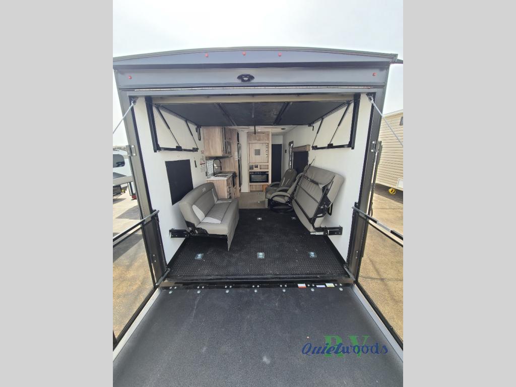 You won't want to go camping any other way once you check out this toy hauler! The front private bedroom will have you feeling right at home with the 60" x 74" queen bed and the entrance into the dual entry bathroom. Now that you're ready for the day, you can start cooking some cinnamon rolls in the 17" black oven while you relax in one of the garage chairs next to the fireplace and enjoy your morning coffee. The Sit N Sleep quick release sofas with a table in between are not only great for enjoying meals, but also transform into an extra sleeping space, plus there is a Sleep N Store manual bed system above them for more sleeping space!