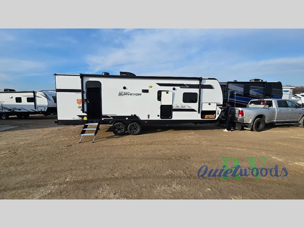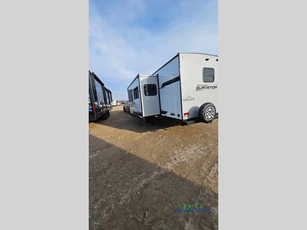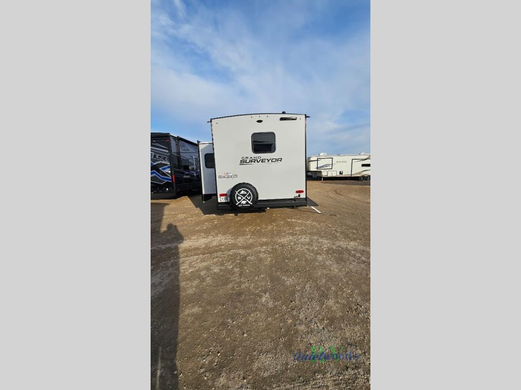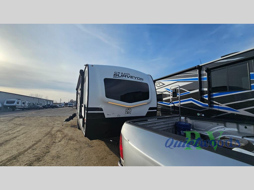 With any Grand Surveyor travel trailer by Forest River you will enjoy turn-key ready-to-go features and quality construction! Each model includes Azdel composite walls and a gel coated fiberglass front cap with an automotive style tinted windshield for a sleek look. There are friction hinge black glass entry door(s), an adjustable platform step with a night light, plus Goodyear tires and a power tongue jack for easy towing. The interior will have you feeling right at home with roller shades, residential faucets, sinks, and bathroom vanity, plus Surf(x) seamless countertops throughout. You can also plan for adventure with a 2" rear accessory and exterior spray port, and there are slam latch baggage doors throughout to keep all your gear secure. Other stand-out features include a central vacuum system, a 200 watt solar panel with a 30 amp controller, a tankless water heater, carpet-free interiors, and the list goes on!