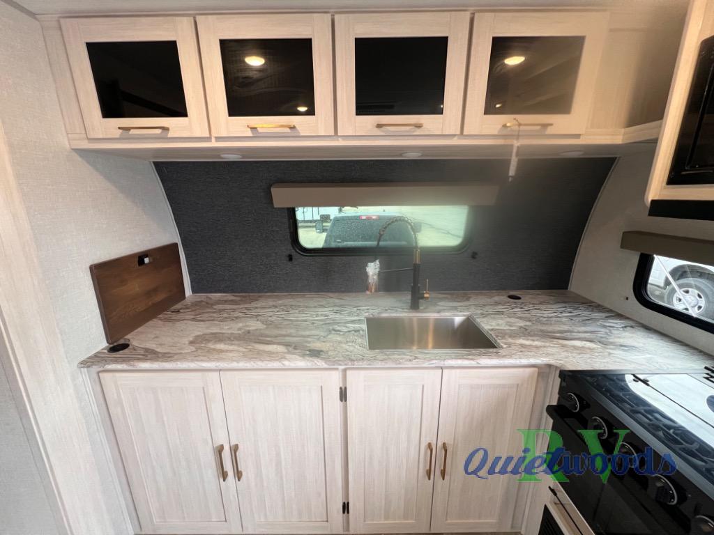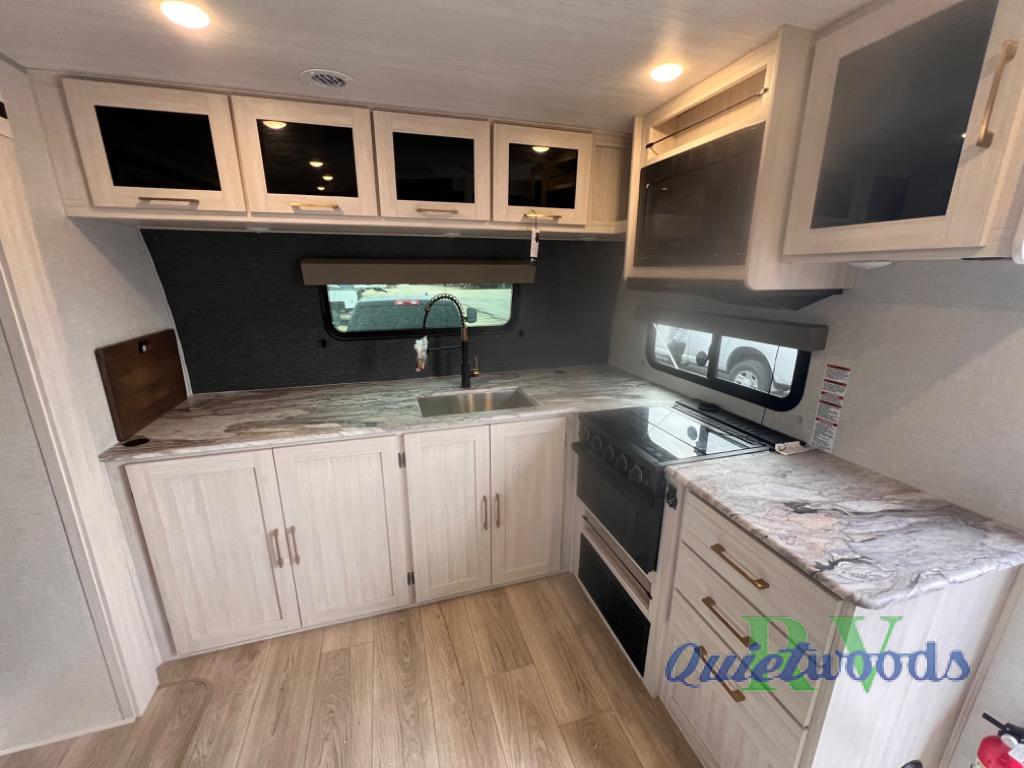 This dual entry, front kitchen travel trailer is perfect for three to four campers. You will have a rear private bedroom with a walk-around queen bed, dual wardrobes, TV prep, plus your own exterior entry door. Your guests can sleep on the booth dinette within the slide out, or you can choose the optional tri-fold sofa with a removable table. Preparing meals each day will be a breeze in the front kitchen that includes ample counter space, a residential range top with a glass cover, plus a spacious walk-in pantry. There is also an outside kitchen with a refrigerator, an 18' power awning with LED lights, and a pass-through storage for camp gear!