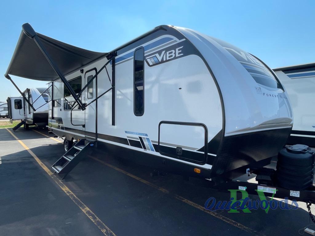 Each Vibe travel trailer by Forest River includes Hyper Lyte construction and a durable laminated "Aluma Frame" for years of use. You will also find an outside shower, a 200-watt roof mounted solar panel, and heated tank pads that will help extend your camping season. The Reserve Package has many at-home features you are sure to enjoy, like the decorative window treatments, solid surface countertops, new black chef's appliance package with an air fryer, and more! These models also include cable and satellite prep and a digital TV antenna with a booster so you can stay connected to the outside world if you choose. Make the easy choice and choose a Vibe travel trailer today!