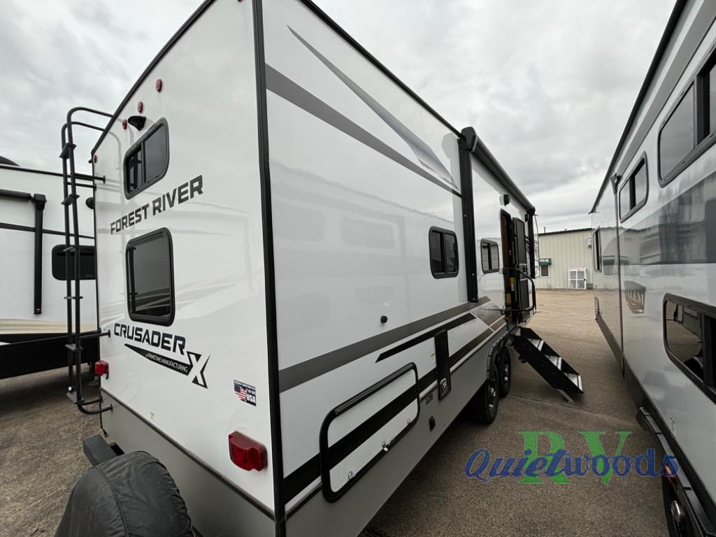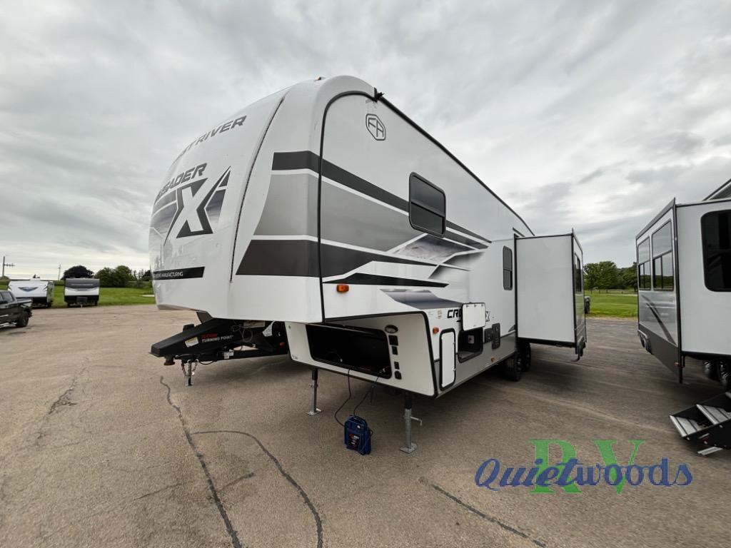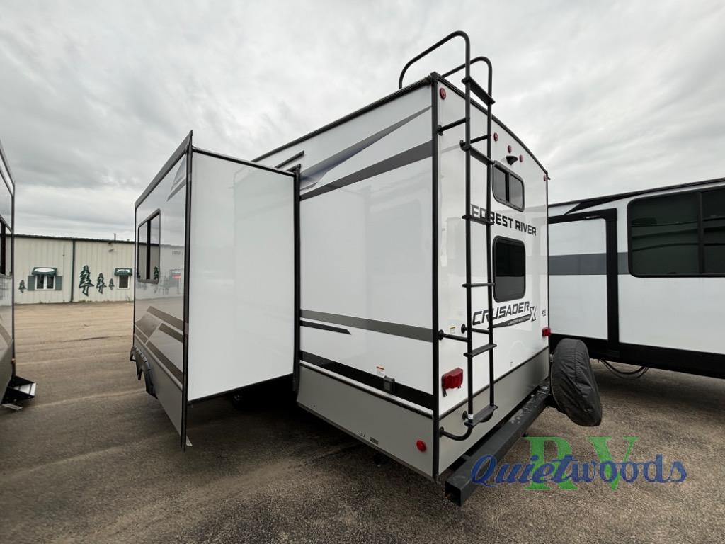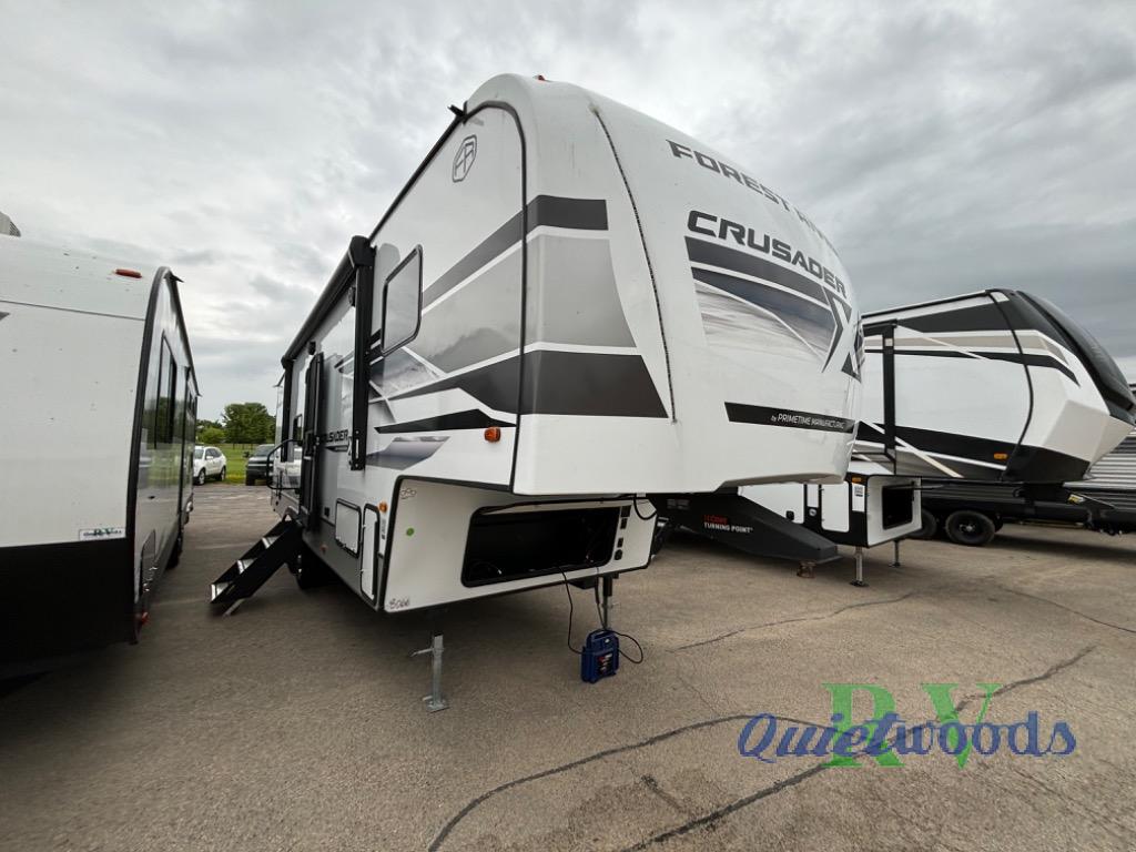 The Crusader fifth wheels by Prime Time RV are a step above the rest and it's not hard to see why. Each model has been constructed to last with its exclusive Eternabond construction, a one-piece TPO roof, and high gloss gel coat fiberglass exterior. The auto leveling system and the comprehensive universal docking center will have you set up to camp in no-time, and there is a convenient bottle opener and Doggy D-ring for your furry companions. You will fall in love with the interior that includes solid surface countertops, designer Carefree linoleum with Scotchgard technology, hardwood cabinet doors, and many more residential comforts. The Crusader also comes standard with dual "Whisper Quiet" ducted A/C's, a 35,000 BTU high capacity gas furnace, and the Extreme Thermal Package Plus, making your camping season year-around!