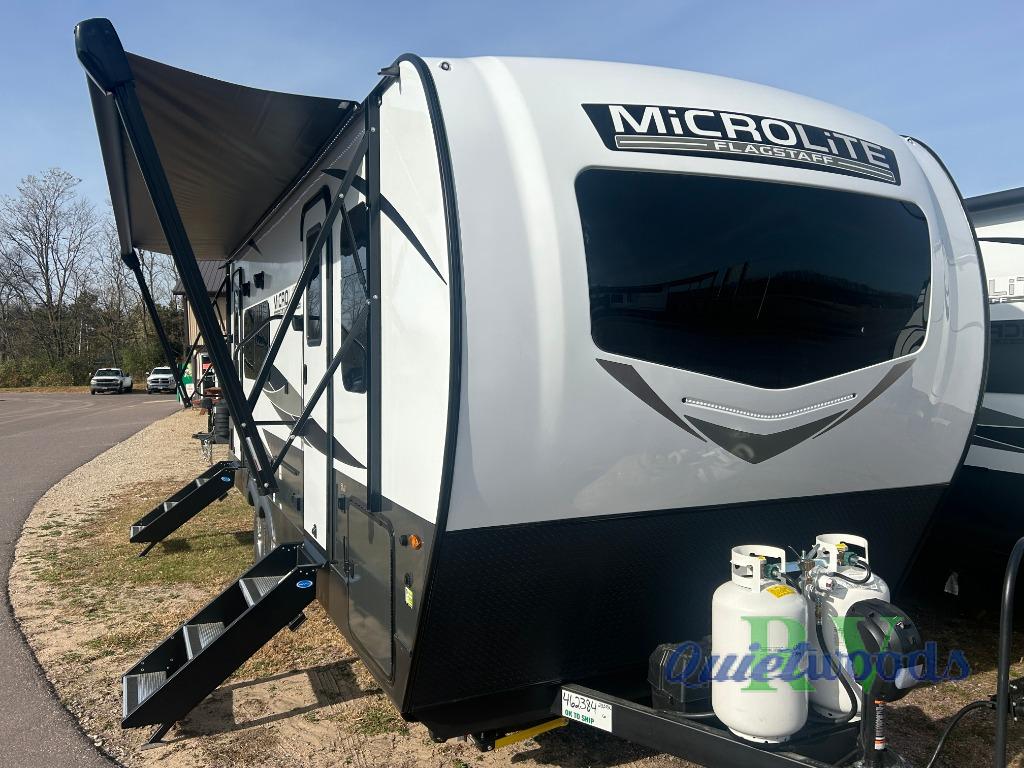 With any Flagstaff Micro Lite travel trailer by Forest River you will enjoy lightweight towing, durable construction, and added interior comforts to make each trip memorable! Each model features a torsion axle, Rubber-Ryde suspension, nitrogen filled, Goodyear Endurance tires, and easy lube axles with Nev-R-Adjust brakes for smooth towing from home to campground. The 6-sided aluminum framed construction provides a strong foundation so you can enjoy your RV for years to come, plus electronically controlled heated holding tanks and an enclosed underbelly will let you camp all year long. Head inside to find hybrid woven flooring in the slide outs, Sedona wood cabinetry, solid surface kitchen countertops, and many more amenities. These travel trailers also include exterior conveniences for hassle-free camping, like the power tongue jack, magnetic compartment door catches, Keyed Alike locks, and rear ladder to name a few!