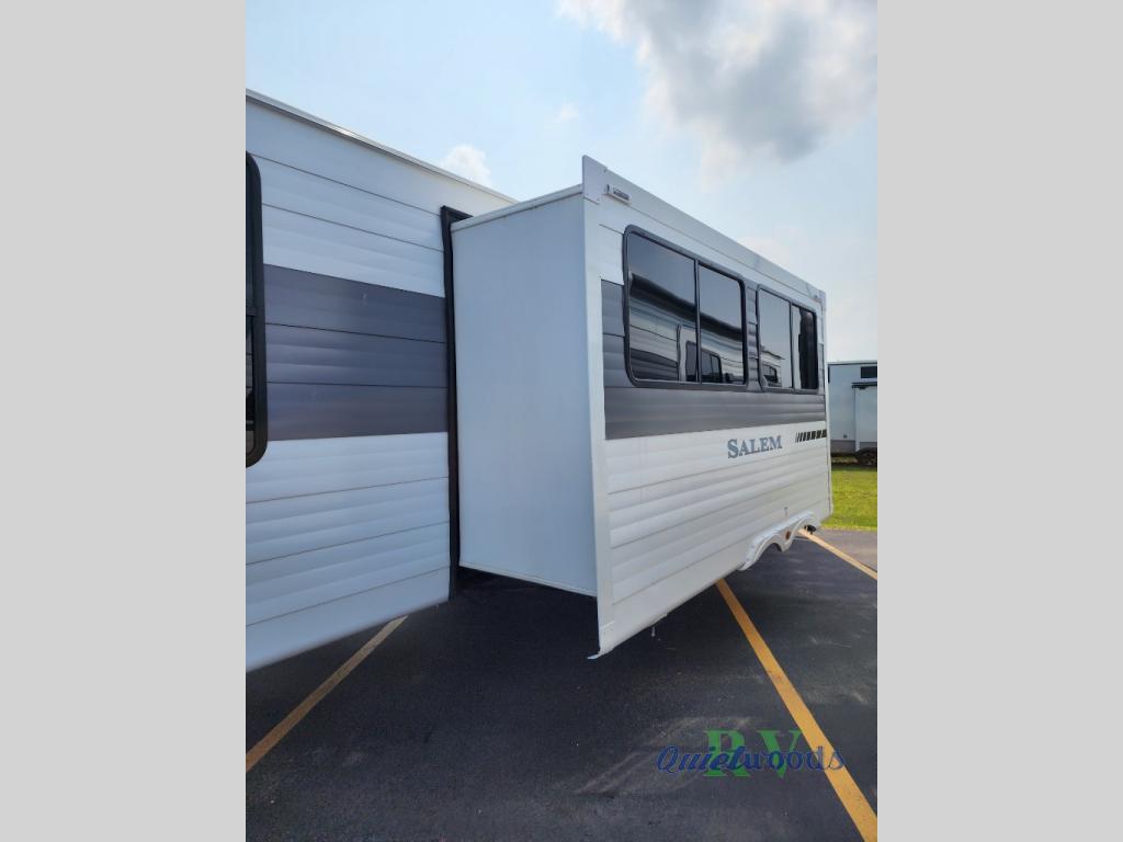 The Salem travel trailers are packed with hassle-free camping amenities! There are a variety of floorplans to choose from between three different regions. The heated and enclosed Accessibelly will help protect against the elements and debris during transport, and the exterior retro/metal redesign is sure to be eye-catching! There are stylish roller shades inside, along with updated backsplash, elegant curtain rods and curtains, plus many more interior comforts! Choose a Salem travel trailer today for quality and value!