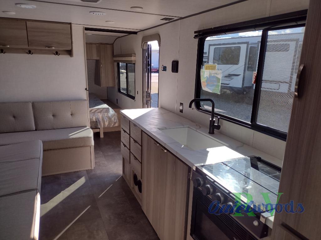 Camping is made easy in this travel trailer with at-home comforts! You'll have the front private bedroom with a king bed all to yourselves, and there are dual bedroom wardrobes to keep your space neat and clean. Any additional guests can sleep on the super lounge with a removable table. You will appreciate the full rear bath complete with a linen closet and dual bath sinks so you both can get ready for bed at once. And a full kitchen lets you whip up your best meals!