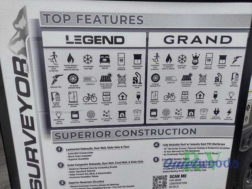 With any Surveyor Legend travel trailer by Forest River you will enjoy quality craftsmanship, convenient amenities, and at-home comforts. The Azdel composite walls provide a longer-lasting trailer, and the power tongue jack with a hitch light will get you back on the road in no-time. There are also Goodyear tires and a tire pressure monitoring system for hassle-free towing. Each model includes the Surveyor Legend Package that comes standard with oversized dinette storage access doors, front slam latch baggage doors, plus an automotive style tinted front windshield. You'll appreciate camping with a tankless water heater for endless hot showers, a 2" accessory hitch to bring bikes along, plus carpet-free interiors and a central vacuum system for easy clean up.