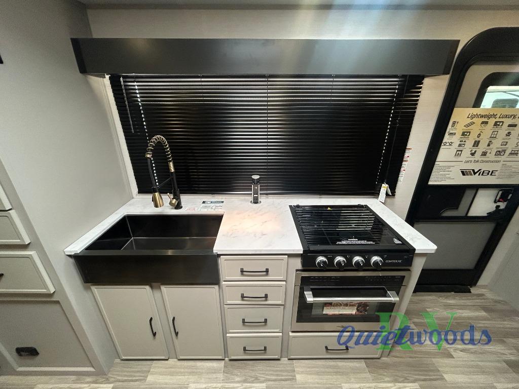 With any Vibe travel trailer by Forest River, you will enjoy comfort at every turn! There is a Norco huck-bolted steel frame, an enclosed underbelly with 12V heating pads, and a PVC roof membrane for added durability. You will also find a universal docking station outside, along with slam latch doors, European style square windows, and an automotive painted front cap. Head inside to enjoy the premium residential-style furniture, decorative window treatments, privacy shades in the living room and bedroom, and many more comforts!