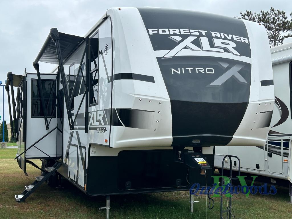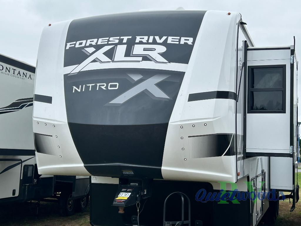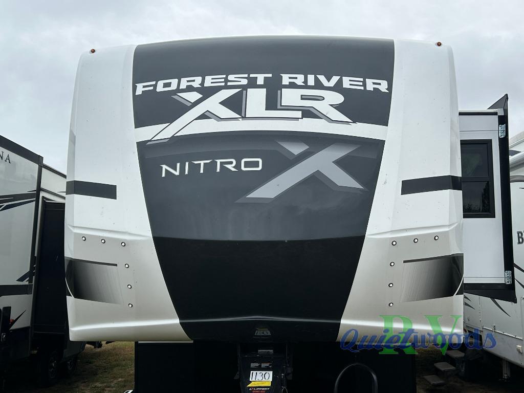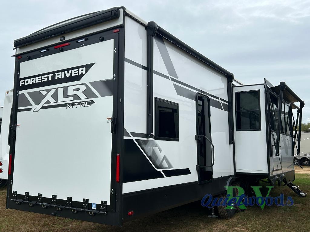 The outdoor enthusiasts has met their match with the XLR Nitro toy haulers by Forest River. The vacuum-bonded aluminum framed sidewalls, gel-coat fiberglass exterior, and singular roof membrane are just a few durable construction materials you will find on these models. There is a weatherproof insulated ramp door, 5,000 lb. cargo tie-downs, a 40 gallon fuel station, and more convenient garage features that will make camping with toys easier than ever. You'll appreciate smooth towing thanks to the MORryde CRE3000 suspension enhancement and 16" Goodyear Endurance tires. A 200 watt roof-mounted solar panel also comes standard, along with electric awning(s) with LED lights, undercarriage lighting, and friction hinge entry door(s). Some of the innovative technology features include a Winegard Air 360 antenna with WiFi prep and 4G LTE, convenient USB charging stations, and a Gear Guardian wireless camera for inside the garage to help keep your gear secure. You will also find diamonds solid surface kitchen countertops, Luna Quartz bathroom countertops, hardwood cabinet doors, stylish window trim package, and many more interior comforts.