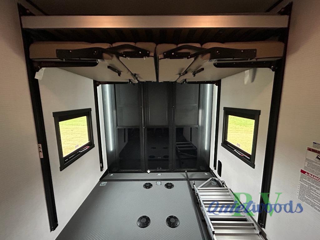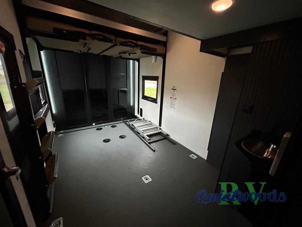 When you're ready to kick up some mud, hitch this toy hauler up and head out! You can set up the patio deck once your toys are removed from the 14' separate garage and relax with a cold drink. You'll find seating space on the Sit N Sleep roll-over sofas with a removable dinette table in between, and the Sleep N Store electric queen bed will provide sleeping space for your guests. There is also a loft and a half bath for even more convenience. Head through the garage glass sliding doors to the living area with an L-shaped sofa and theater seating, or start lunch in the shared middle kitchen with ample counter space. There is even a free-standing table and chairs like you would find at home. The full bath up front lets you clean up after a trail ride and the front private bedroom will have you feeling right at home. A king bed slide out comes standard, along with a large front wardrobe with washer and dryer prep, plus a dresser and TV backer if you want to add your own TV.