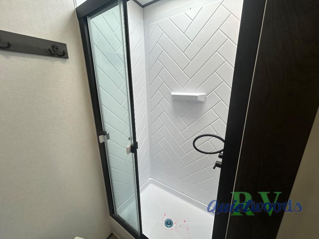 This travel trailer is the perfect match for a couple. It offers comfort and space thanks to the queen size bed with storage below, dual wardrobes and night stands beside the bed. Spend days of fun with the entertainment center which has a 40"TV and theater seats. Also, the rear bathroom is perfect to take a shower after a long day of adventures.