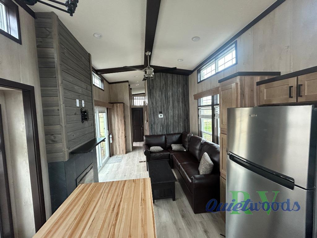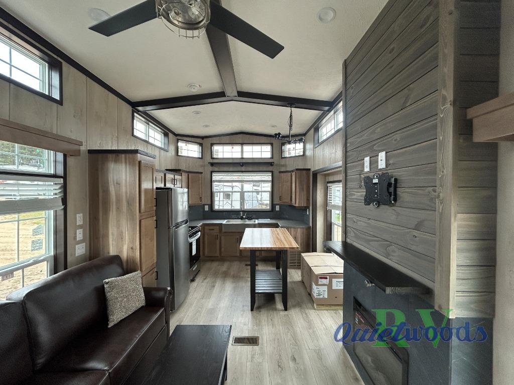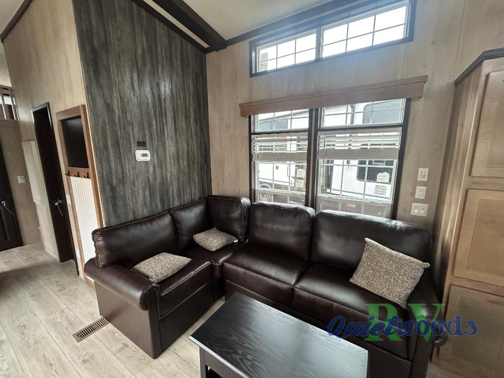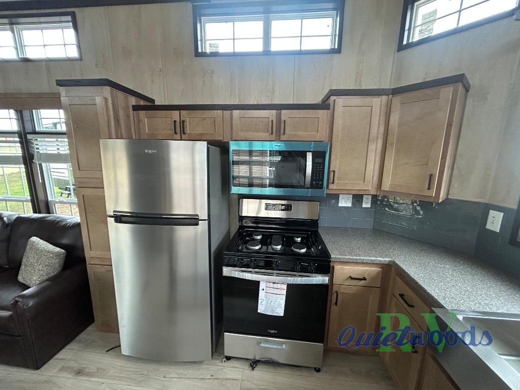 Head out on adventure in this spacious park model. You will love the front kitchen with tons of counter space and a four burner cooktop to prepare meals at. There is an entertainment center where you can add a TV, and the kitchen island will provide more counter space. This model includes a pantry to store dry goods and snacks, a chalkboard the little ones are sure to love, and a space to add an optional washer and dryer prep if you choose. Don't let this model pass you by!