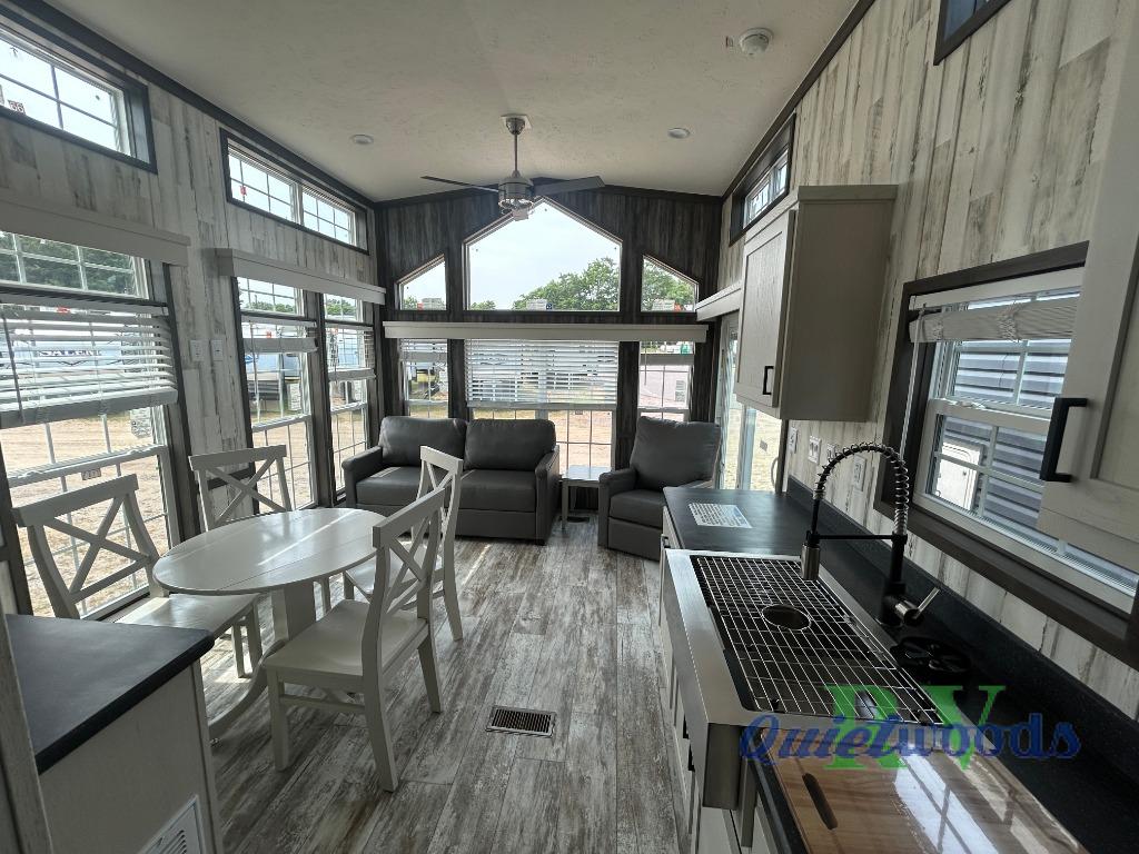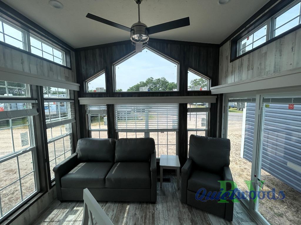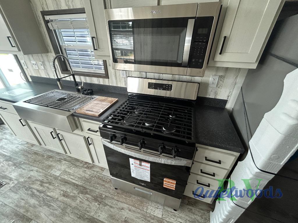 With any Country Manor park model by Fairmont you will enjoy years of use and memories thanks to the solid construction materials, such as an Owens Corning architectural shingled roof, a woven shepweave underbelly, a HomeGuard exterior weather house wrap wind barrier, and more! The Kinro windows will allow plenty of natural light in, and the residential crown molding will give that touch of luxury. Each model includes stainless steel Whirlpool appliances, high pressure dual laminated countertops and backsplash, and European style hidden cabinet hinges. These models also feature 1/2" residential textured drywall cathedral ceilings for better insulation and sound proofing, and the three decor choices will allow you to customize the interior to your liking.