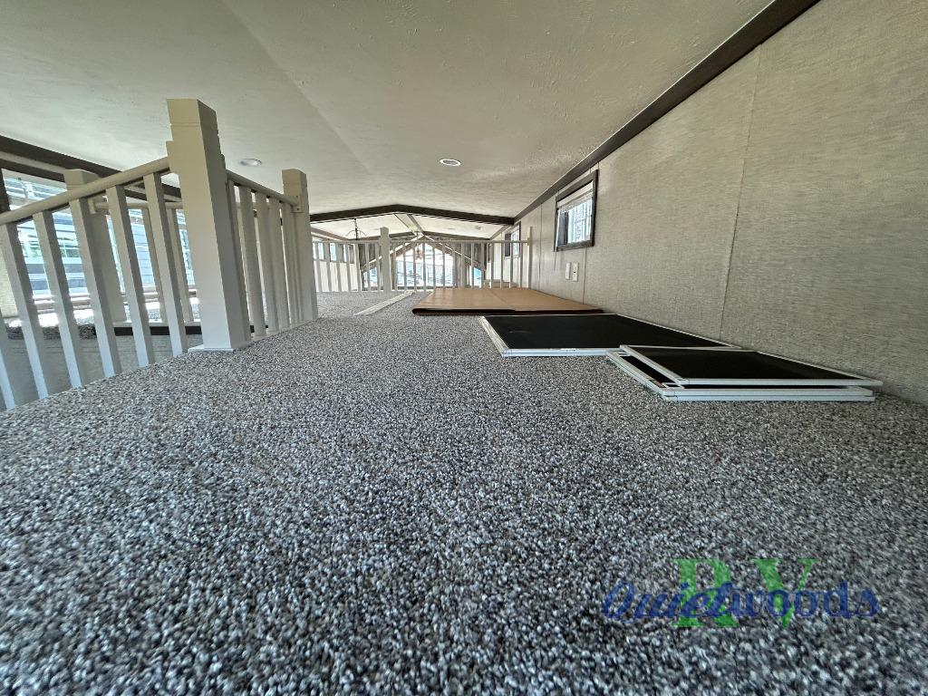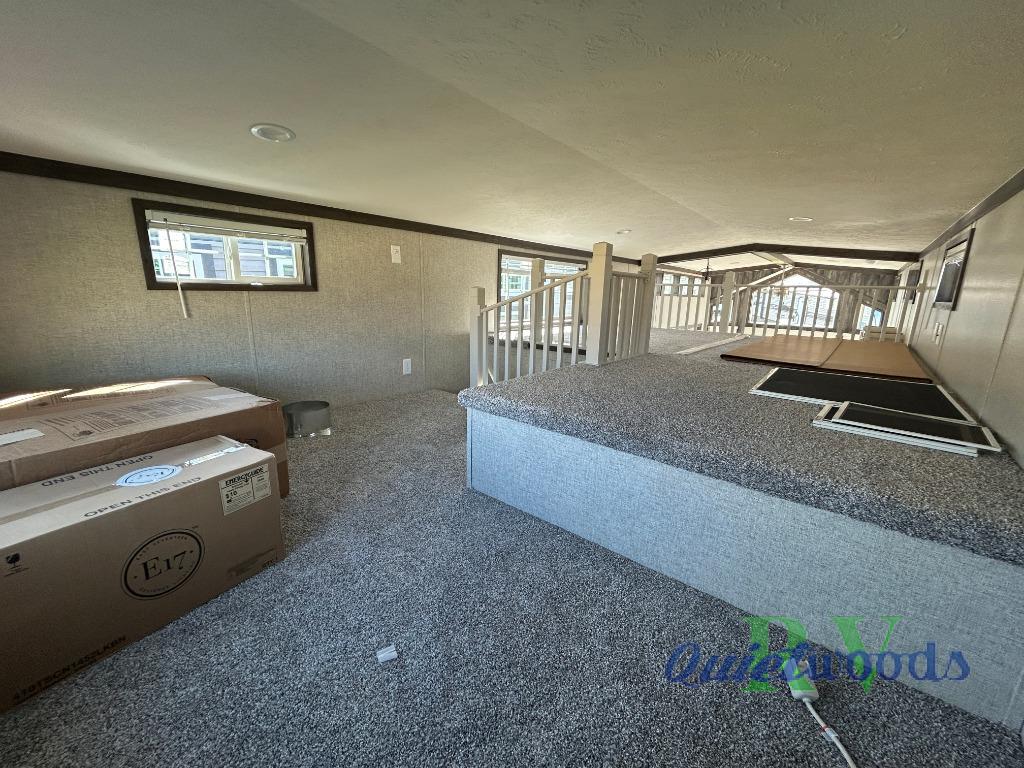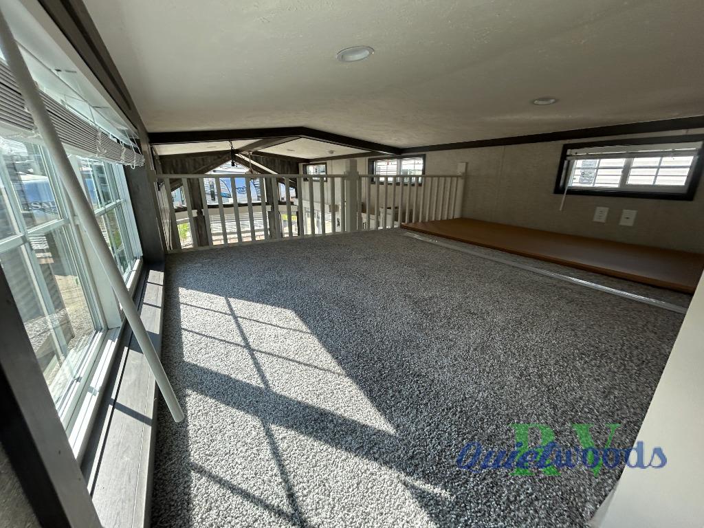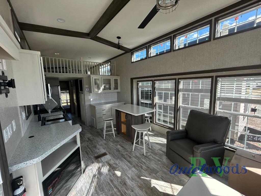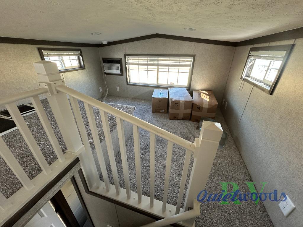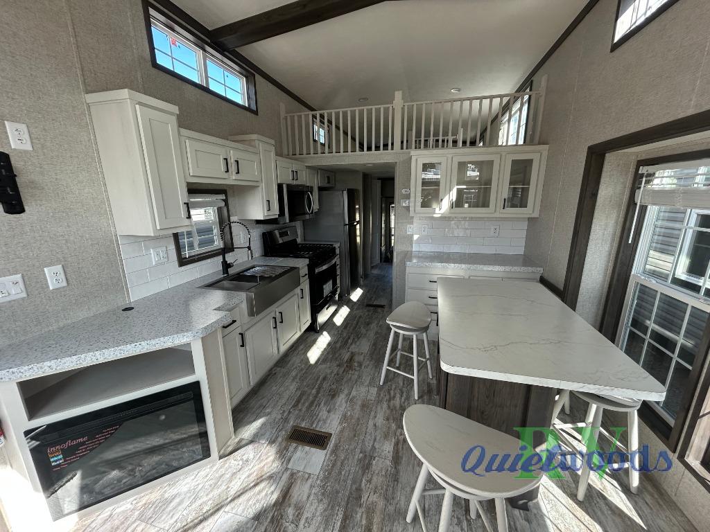 This park model with a loft is sure to make you feel right at home. This area will be perfect for little ones or storage of luggage and gear. The rear sunken bedroom includes a queen bed and dual nightstands for your book and glasses. Stay fresh each day with the one-piece tub/shower, and you can store your necessities in the lighted medicine cabinet. The living area includes a queen hide-a-bed sleeper sofa and an optional fireplace for a more at-home feel. You will love how much counter space you have in the kitchen, and the four burner cooktop will allow you to cook up any meal you have planned. You may also like to choose model 100187 that features a flat floor bedroom!
