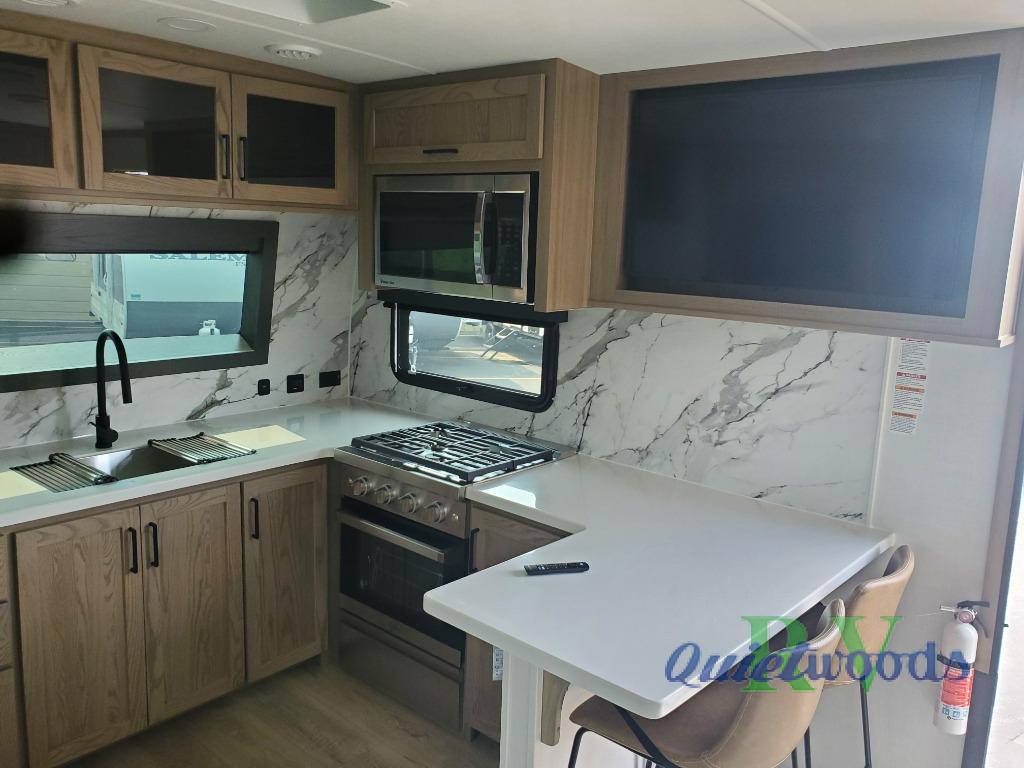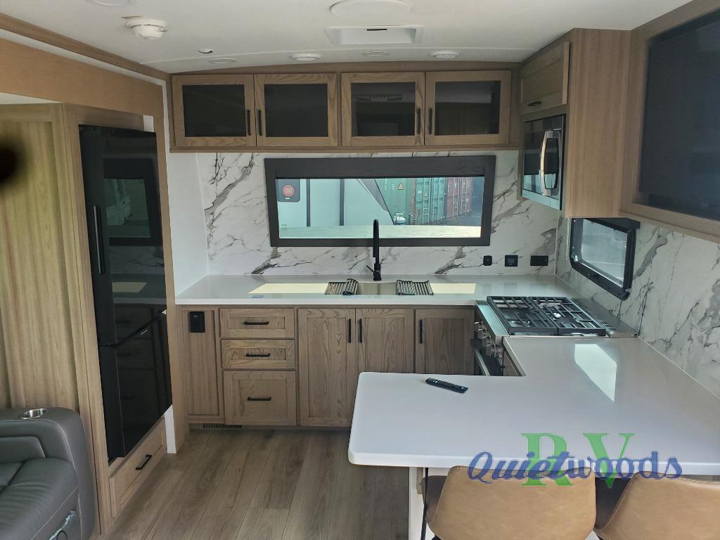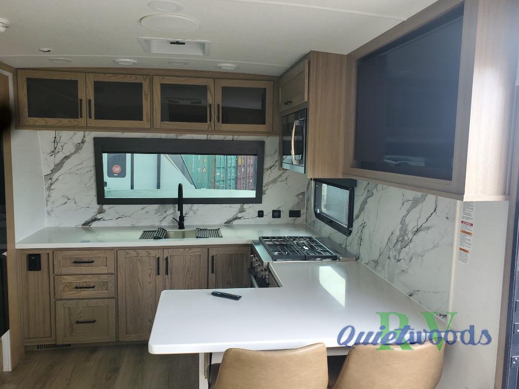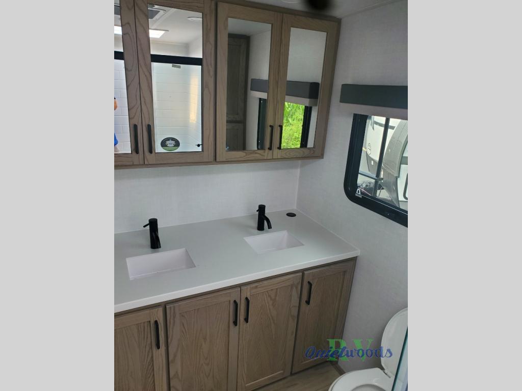 You will love how open this travel trailer will feel with the large front window that you can look out from the two-person bar top seating! The front kitchen has plenty of countertop space for you to prepare your best meals. Your nights will be spent in true relaxation with a 67" theater seating and king bed slide in the bedroom for a great night's rest. The full rear bathroom has a shower with a seat to take a nice, hot shower before bed, and a dual-sink vanity for two to get ready at once in the mornings!