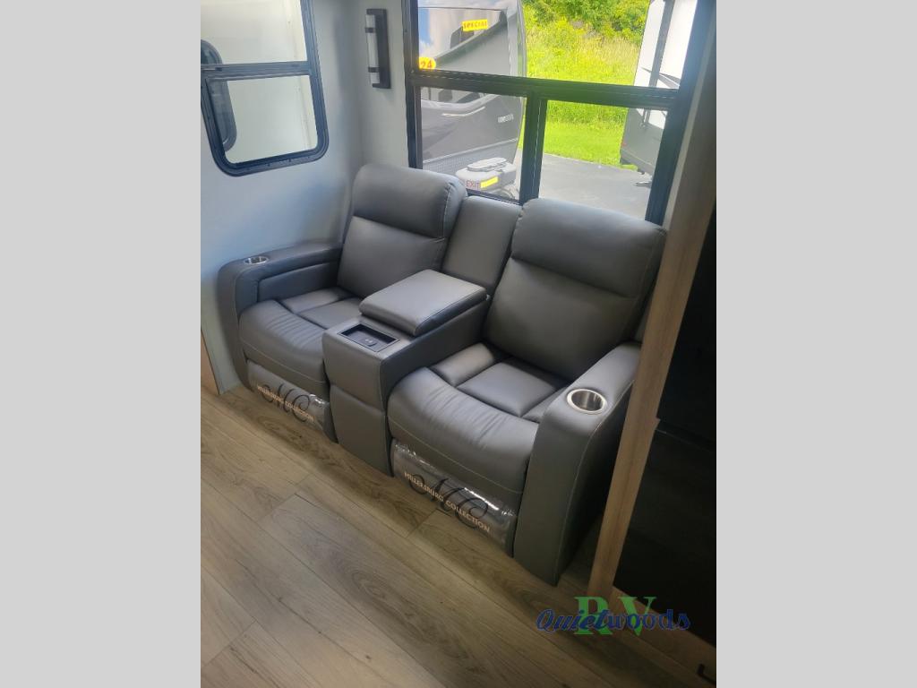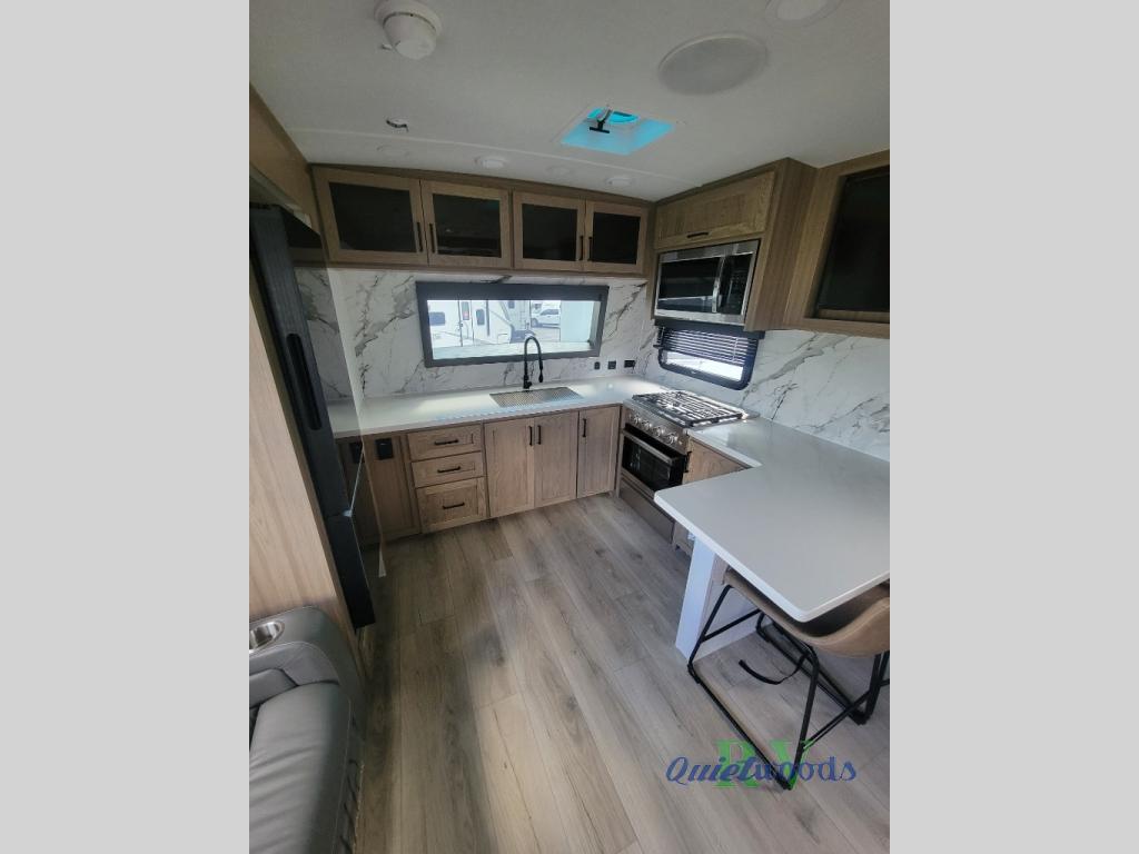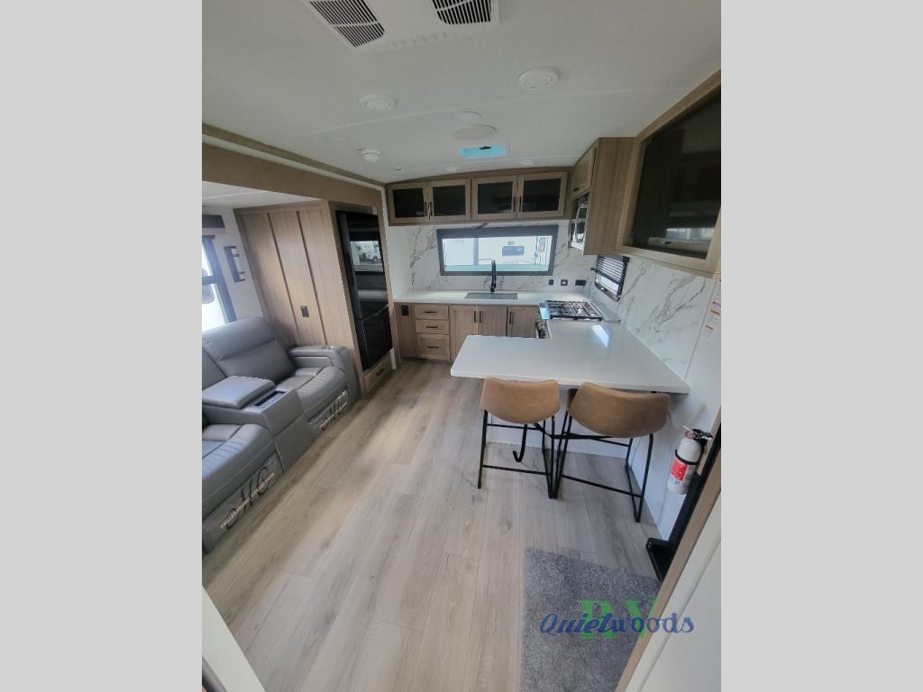 You will love how open this travel trailer will feel with the large front window that you can look out from the two-person bar top seating! The front kitchen has plenty of countertop space for you to prepare your best meals. Your nights will be spent in true relaxation with a 67" theater seating and king bed slide in the bedroom for a great night's rest. The full rear bathroom has a shower with a seat to take a nice, hot shower before bed, and a dual-sink vanity for two to get ready at once in the mornings!
