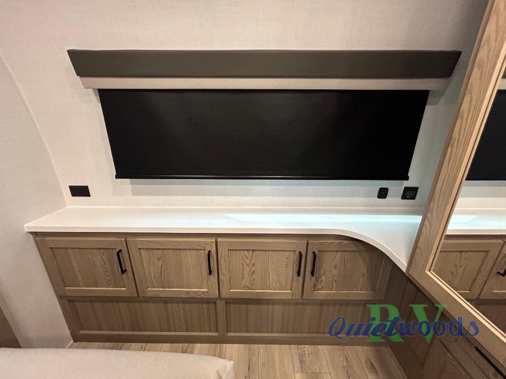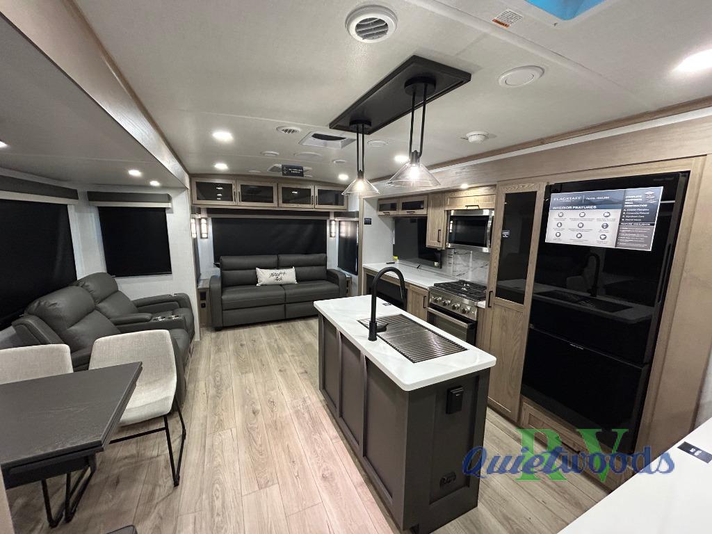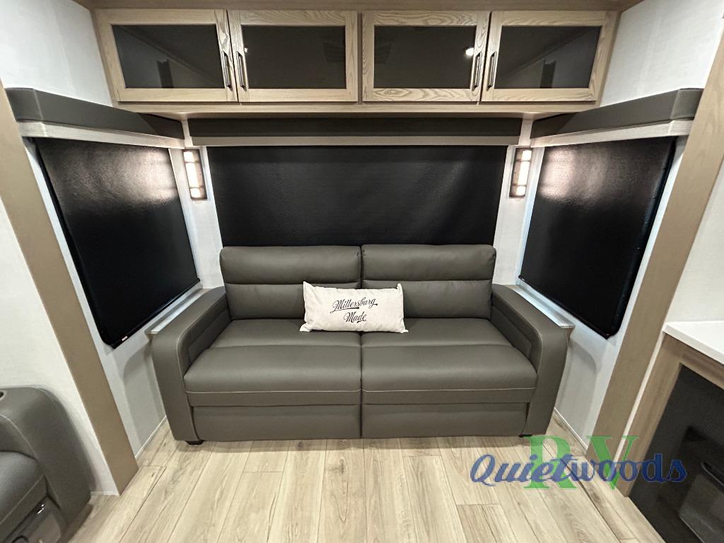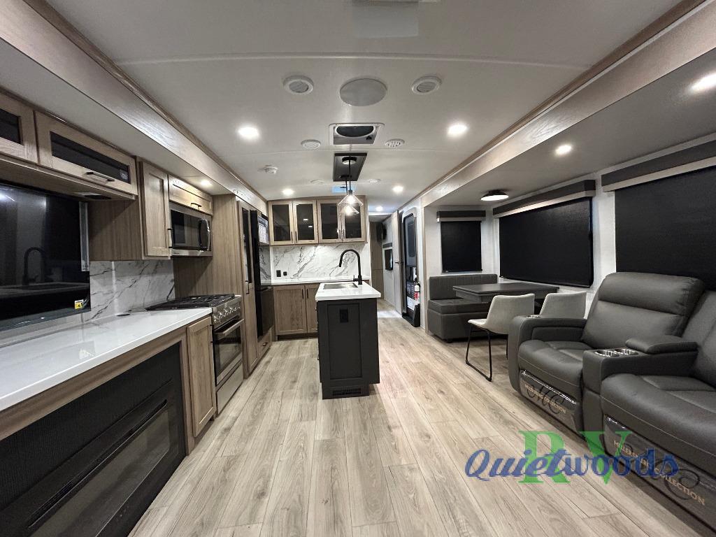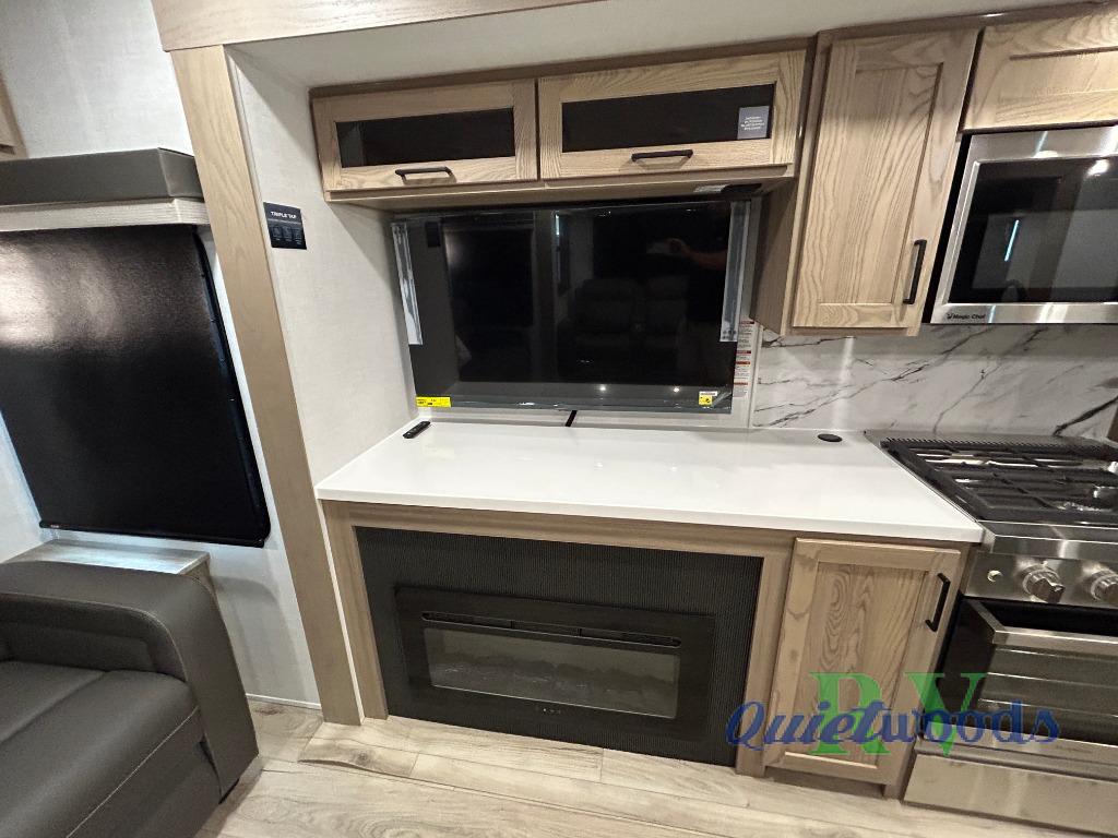 The large windows in the rear and door side slide will bring nature's scenery indoors with this travel trailer! Everyone can relax together in the rear living area featuring a 78" hide-a-bed sofa and 60" theater seating across from the entertainment center with a fireplace. Meal prepping will be even easier with the kitchen island, and the table and chairs with a bench is a comfortable place to enjoy your meals. The full bathroom has a shower with a seat and a linen closet to keep your towels close. You will feel well rested each morning after sleeping on the king bed slide in the front private bedroom which also has a wardrobe with washer and dryer prep and an area to add an optional TV!