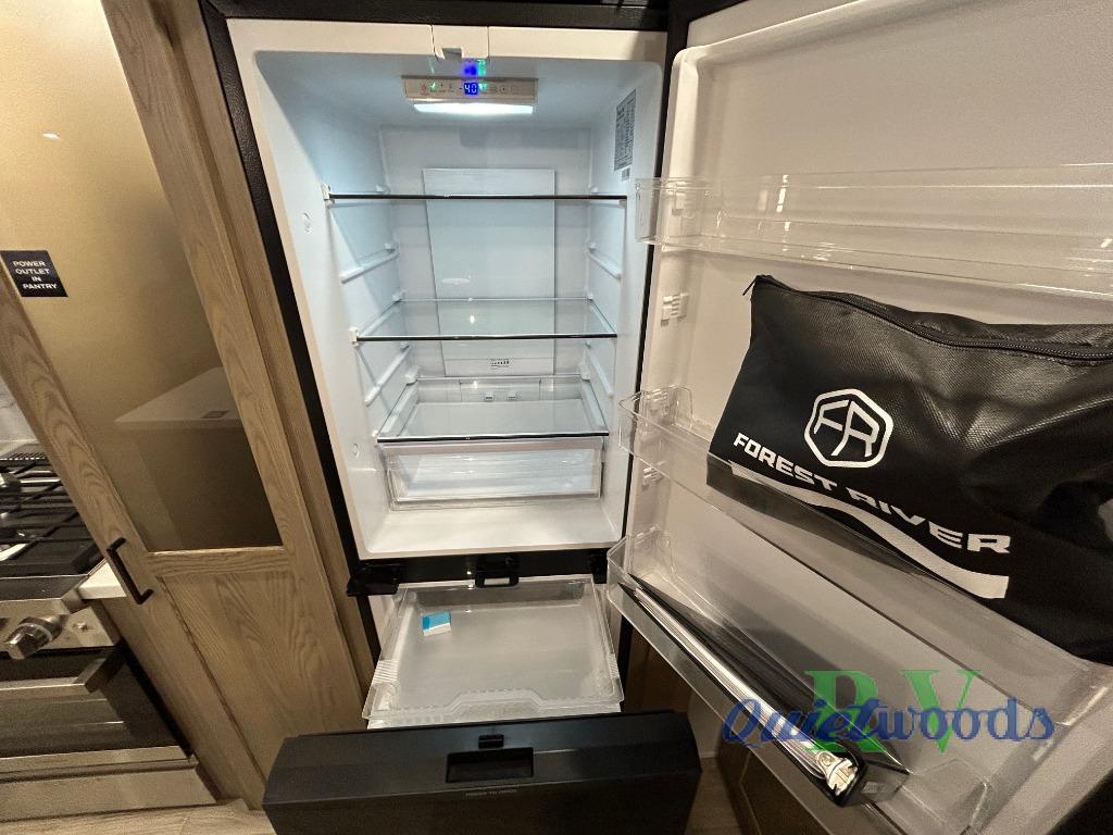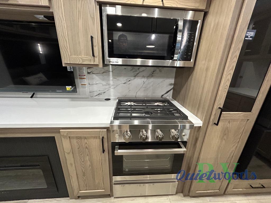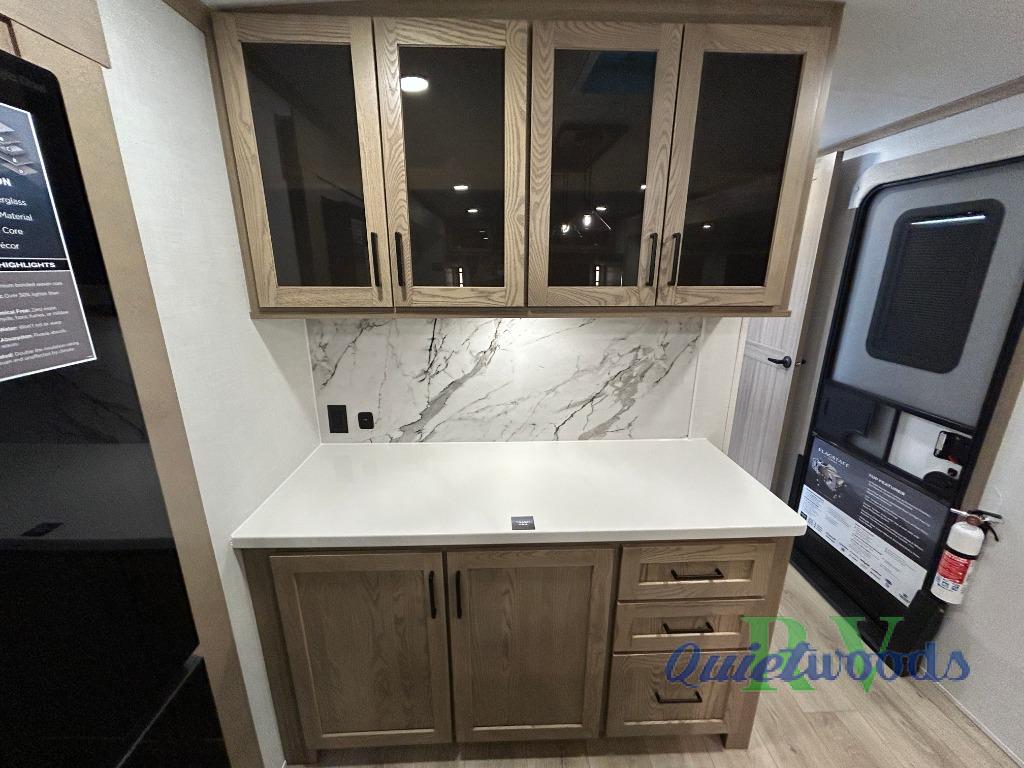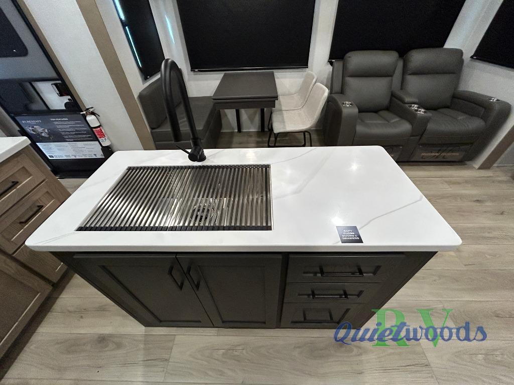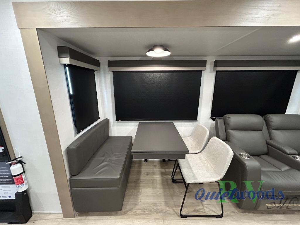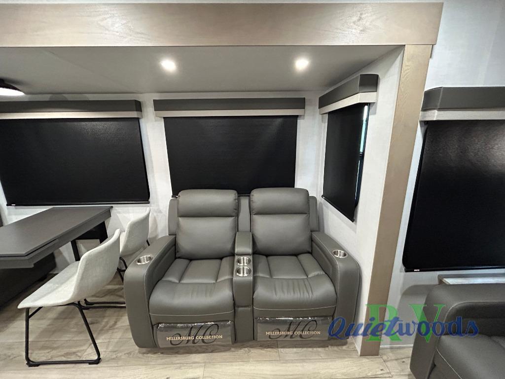 The large windows in the rear and door side slide will bring nature's scenery indoors with this travel trailer! Everyone can relax together in the rear living area featuring a 78" hide-a-bed sofa and 60" theater seating across from the entertainment center with a fireplace. Meal prepping will be even easier with the kitchen island, and the table and chairs with a bench is a comfortable place to enjoy your meals. The full bathroom has a shower with a seat and a linen closet to keep your towels close. You will feel well rested each morning after sleeping on the king bed slide in the front private bedroom which also has a wardrobe with washer and dryer prep and an area to add an optional TV!