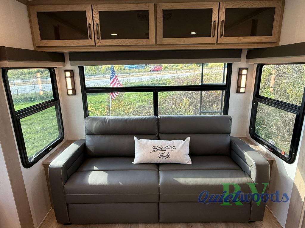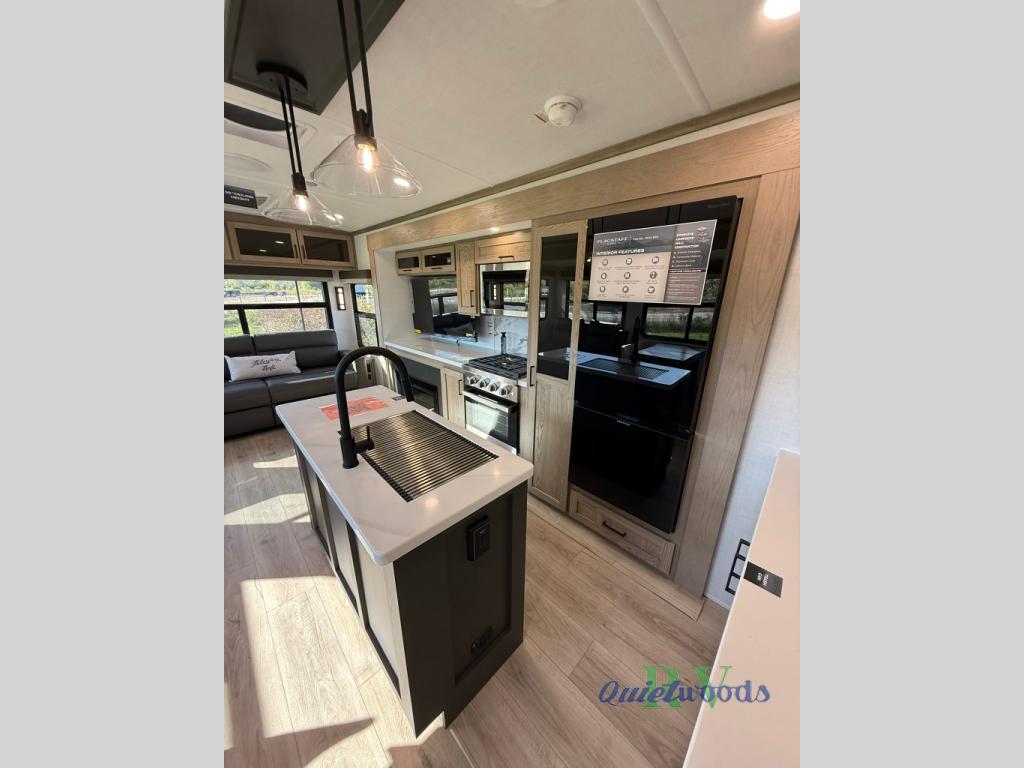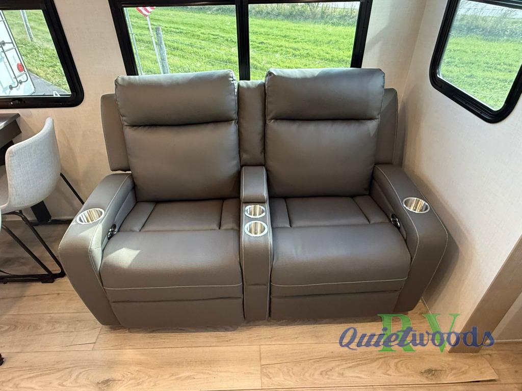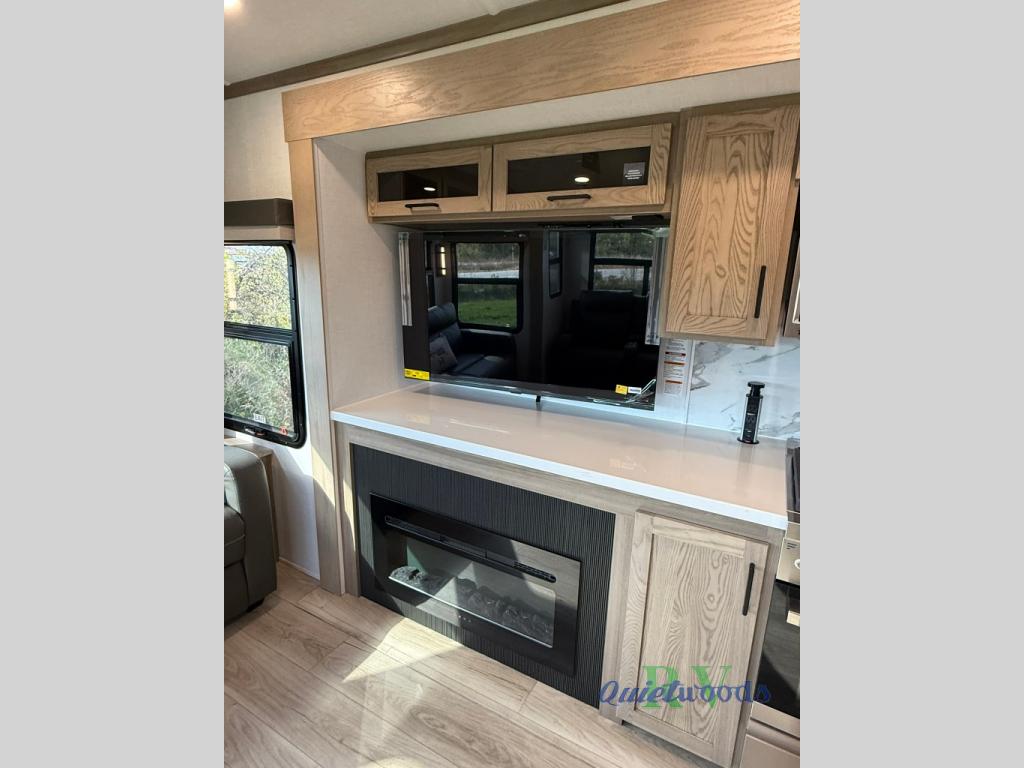 The large windows in the rear and door side slide will bring nature's scenery indoors with this travel trailer! Everyone can relax together in the rear living area featuring a 78" hide-a-bed sofa and 60" theater seating across from the entertainment center with a fireplace. Meal prepping will be even easier with the kitchen island, and the table and chairs with a bench is a comfortable place to enjoy your meals. The full bathroom has a shower with a seat and a linen closet to keep your towels close. You will feel well rested each morning after sleeping on the king bed slide in the front private bedroom which also has a wardrobe with washer and dryer prep and an area to add an optional TV!