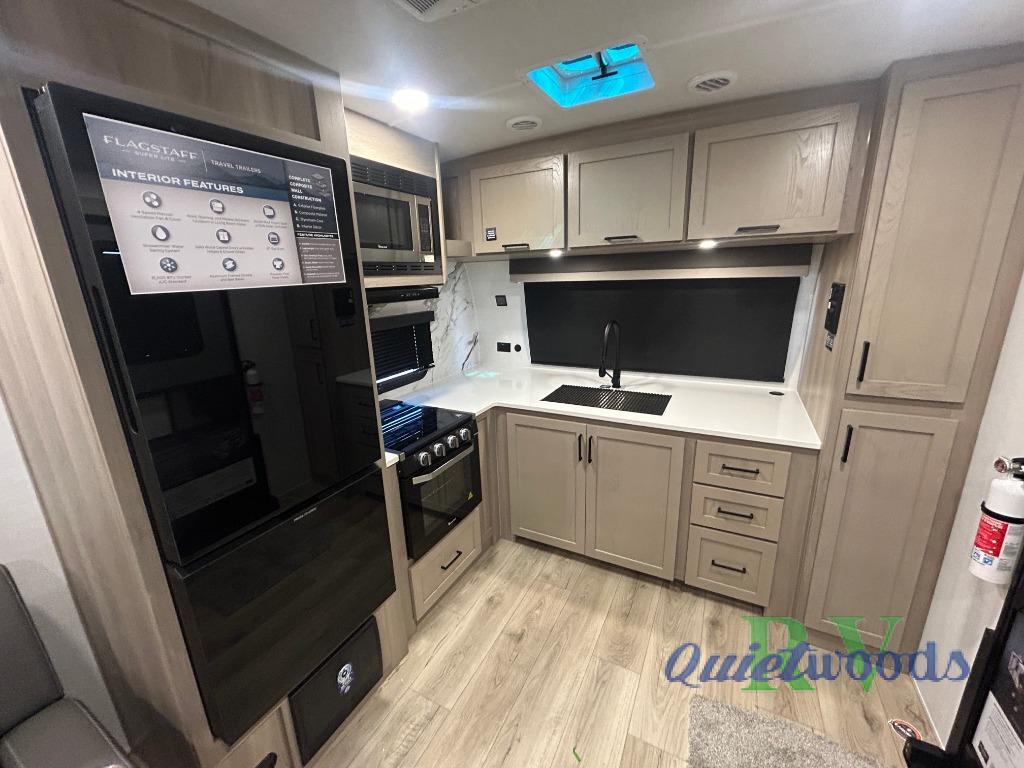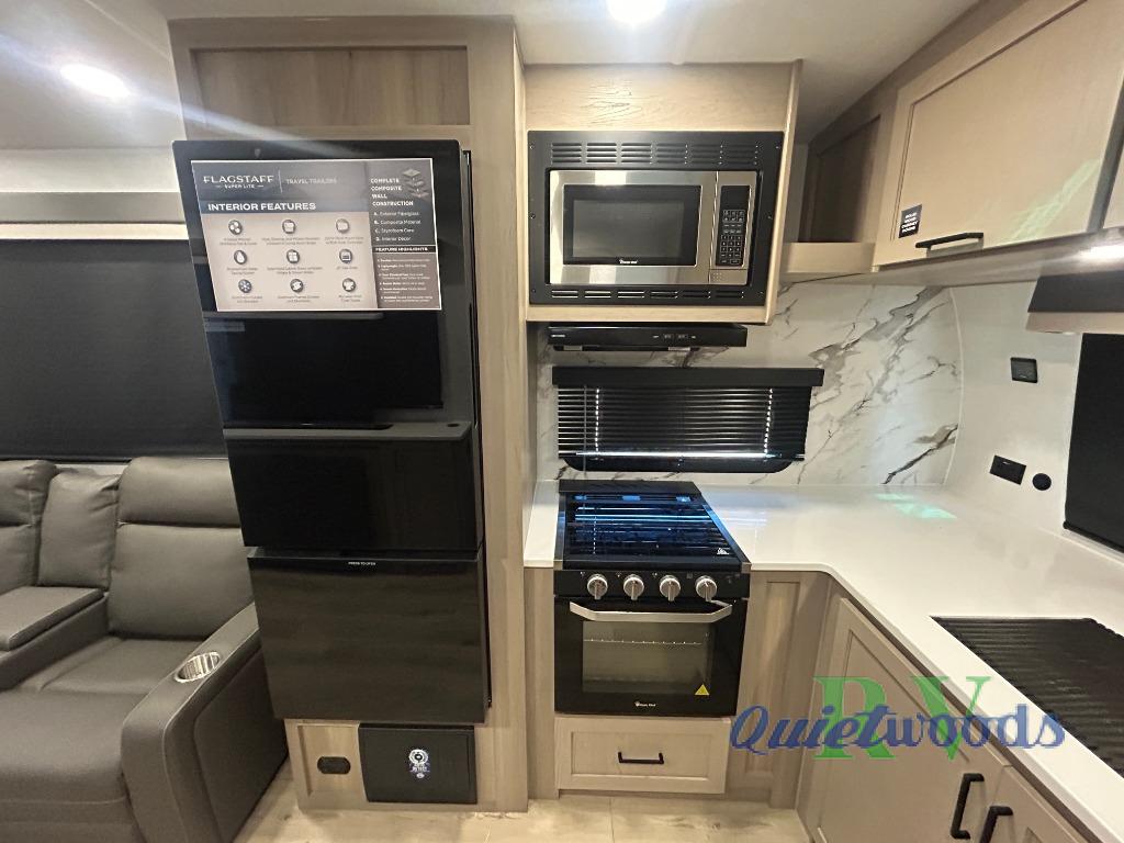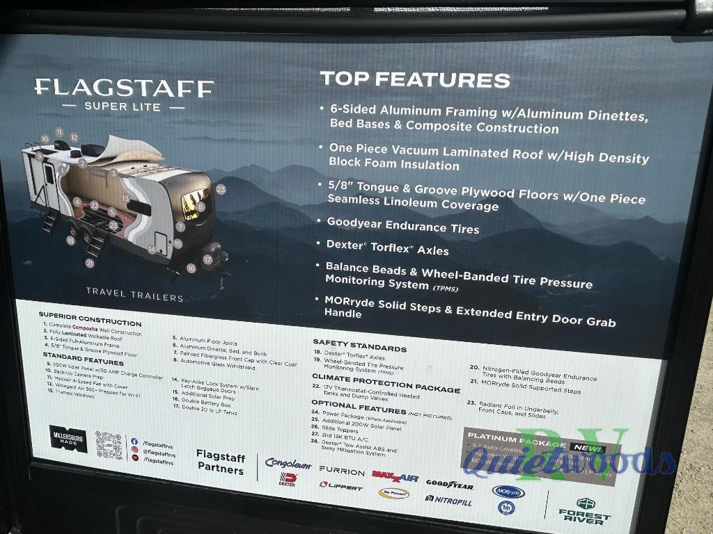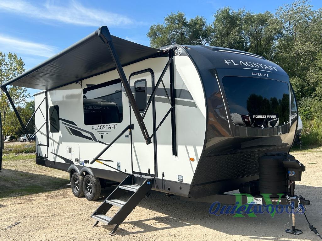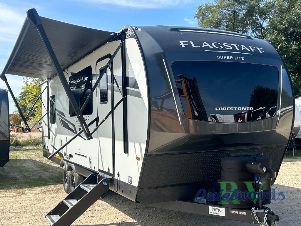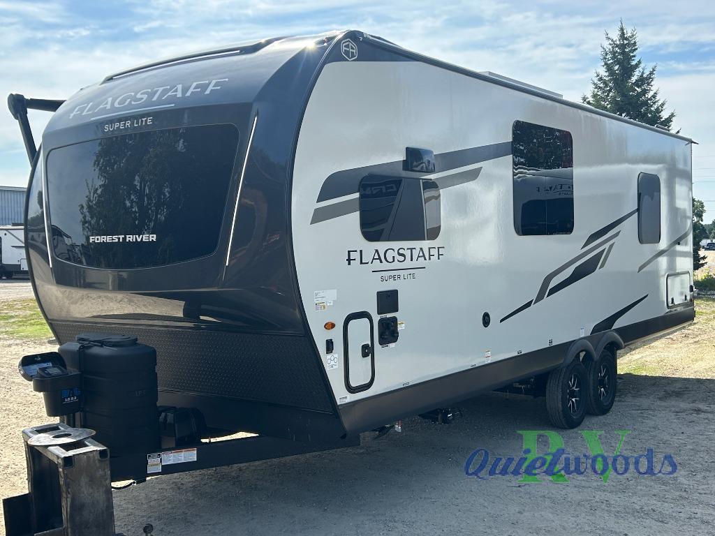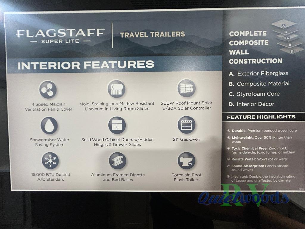 With any Flagstaff Super Lite travel trailer by Forest River, you can enjoy quality features with lightweight towing! The Climate Protection Package includes radiant foil in the front cap, underbelly, and slides, plus there are 12V thermostat-controlled heated tanks for added protection. The complete composite wall construction and 6-sided full-aluminum frame is ultra durable, and the RoadTech tire pressure monitoring adds safety. Each model also includes the Coast to Coast Package that comes with slam latch baggage doors, a high gloss fiberglass cap, Goodyear Endurance tires, plus a 200W solar panel with an optional additional 200W panel for more off grid capabilities. Inside, you'll love the roller shades, solid surface kitchen countertops, a shower miser system, and many more comforts!