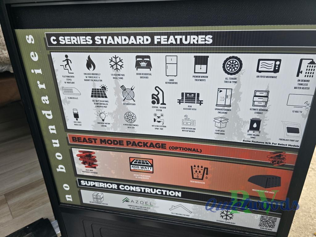 Pack up this very versatile Murphy bed travel trailer and head out to explore! You will love the space saving aspect that a Murphy bed gives you by not increasing the tow length in order to give you a separate bedroom and living space, and you don't even have to make the bed, just fold it up into the wall in the morning! Double-size bunks in the rear corner are perfect for accommodating both children and adults. The kitchen offers everything a cook would need to feed the whole gang and there is even a counter bar area with two stools which will be perfect for breakfast time. There is a booth dinette slide for more dining space, or a place to enjoy a board game or card game when you are inside. When the optional Beast Mode Package on this model is chosen, you'll enjoy a 400-watt solar package, a fresh water filter, a Maxxair roof vent cover, plus a Beast Mode independent suspension for better handling.