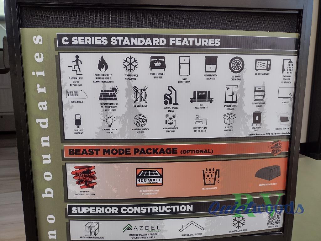 Pack up this very versatile Murphy bed travel trailer and head out to explore! You will love the space saving aspect that a Murphy bed gives you by not increasing the tow length in order to give you a separate bedroom and living space, and you don't even have to make the bed, just fold it up into the wall in the morning! Double-size bunks in the rear corner are perfect for accommodating both children and adults. The kitchen offers everything a cook would need to feed the whole gang and there is even a counter bar area with two stools which will be perfect for breakfast time. There is a booth dinette slide for more dining space, or a place to enjoy a board game or card game when you are inside. When the optional Beast Mode Package on this model is chosen, you'll enjoy a 400-watt solar package, a fresh water filter, a Maxxair roof vent cover, plus a Beast Mode independent suspension for better handling.