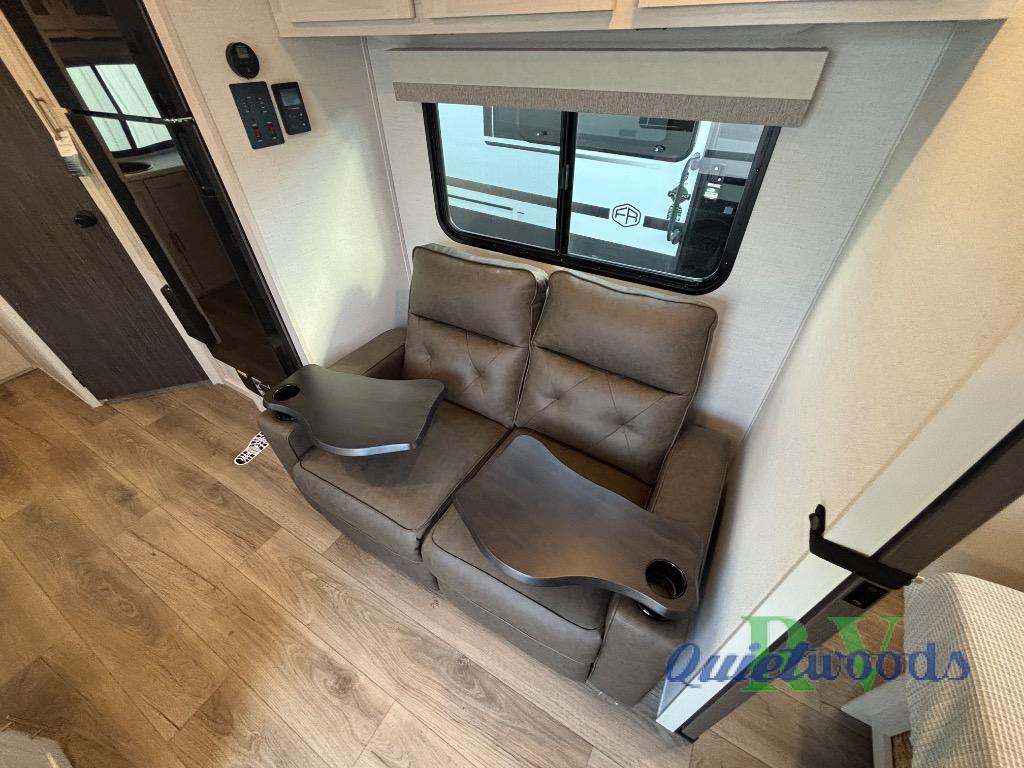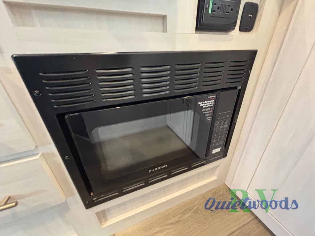 A private bedroom with a walk-around queen bed, a full bath, and sleeping space for guests are a few of the features that you are sure to want in your next RV! You can rest comfortably each night, plus all your clothing can be stored in the dual wardrobes to keep everything tidy. The chef of your group can make meals on the two burner cooktop or in the convection microwave, and there is a 12V black glass refrigerator for perishables. You can relax on the theater seat each evening, and if you're needing additional sleeping space, just choose the optional tri-fold sofa!