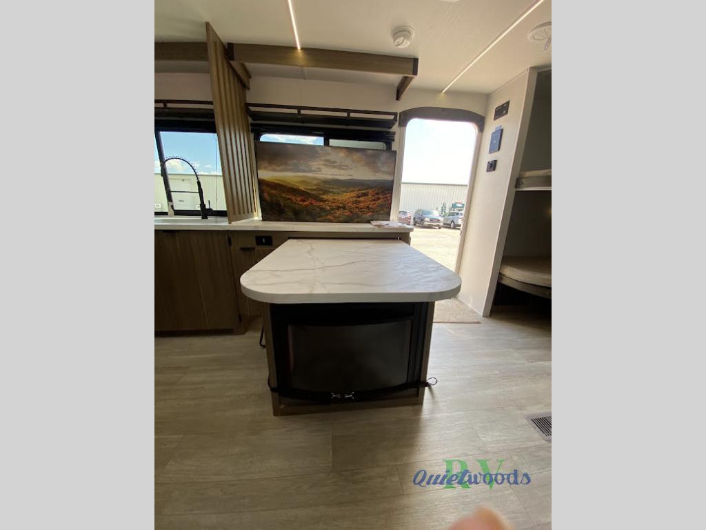 You can enjoy at-home comforts wherever you decide to camp in this travel trailer. The custom king bed with Versa Tilt includes dual shelves and a wardrobe so you can keep your space tidy. If you have a guest or two little ones, they can sleep on the jackknife sofa within the large slide out or on the double-size bunks right next to the full bath. Once you've made breakfast in the fully equipped kitchen, you can utilize the pull-out table to dine at. There is also a fireplace below the table, which will be perfect for cozy evenings indoors.
