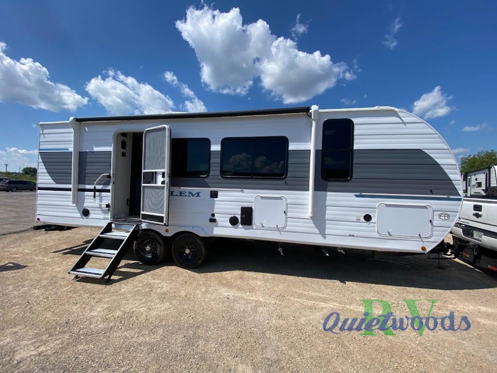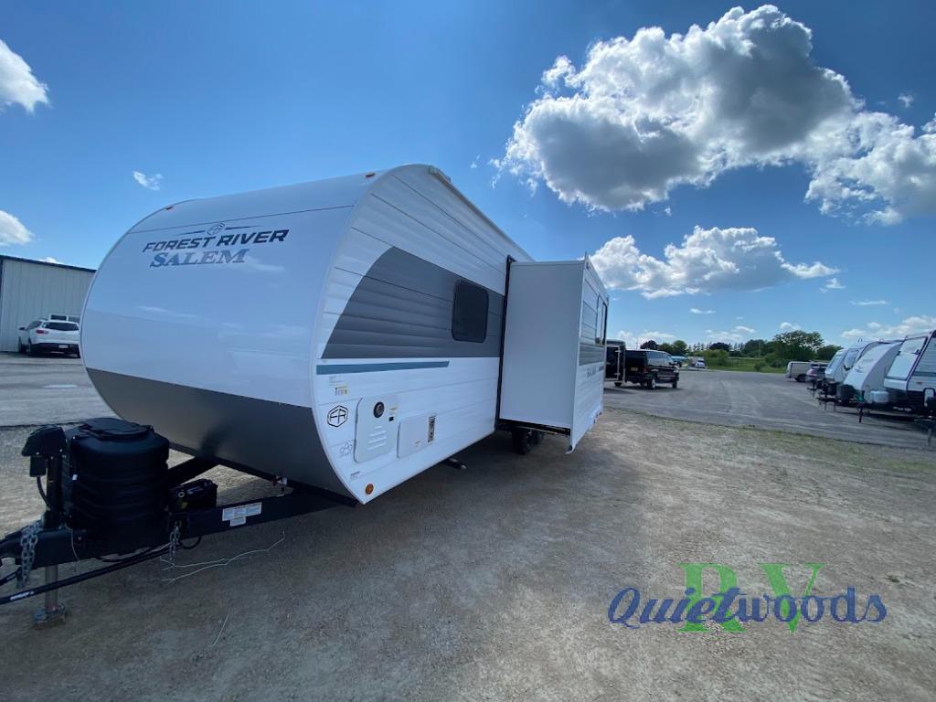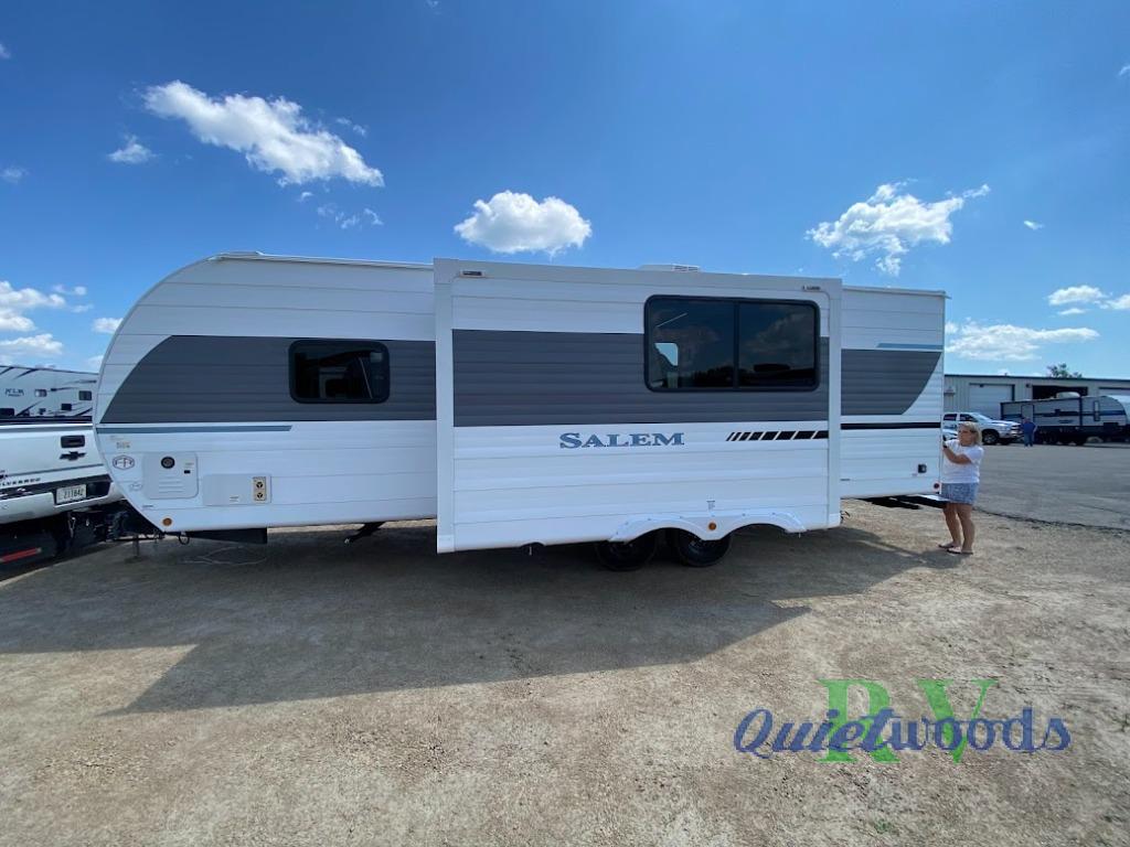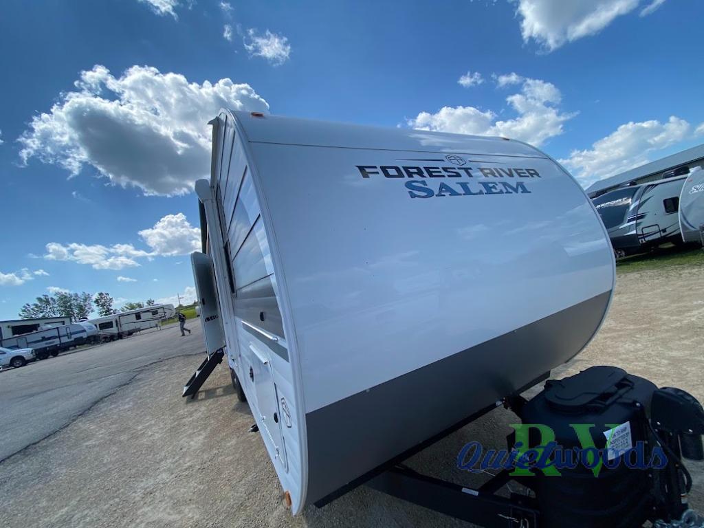The Salem travel trailers are packed with hassle-free camping amenities and there are a variety of floorplans to choose from. The heated and enclosed Accessibelly will help protect against the elements and debris during transport, and the exterior retro/metal redesign is sure to be eye-catching! There are stylish roller shades inside, along with updated backsplash, elegant curtain rods and curtains, plus many more interior comforts! Choose a Salem travel trailer today for quality and value!
