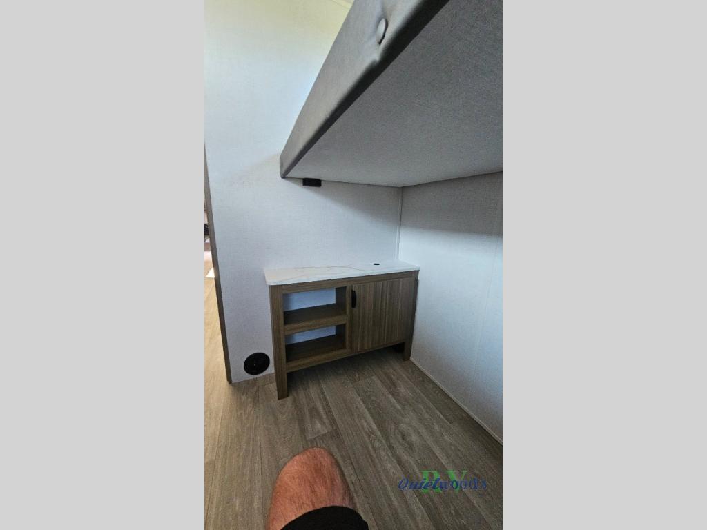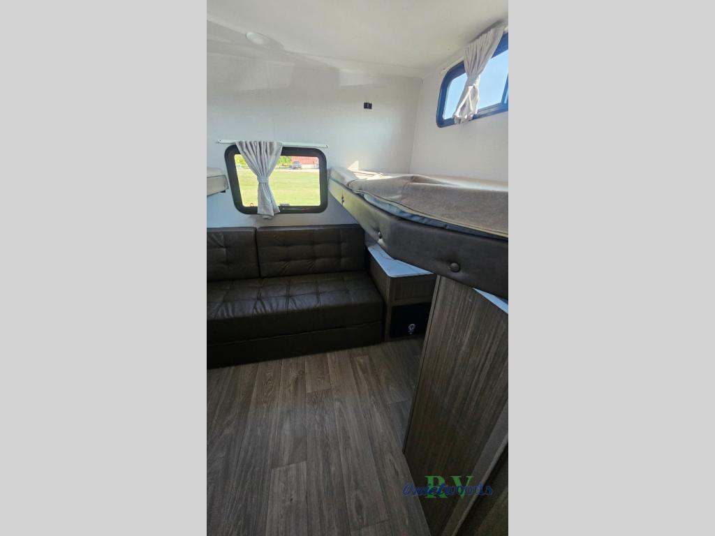 This travel trailer offers a large amount of versatility! The rear private bunkhouse has two 30" x 74" bunks and a sofa bed below that can transform into a bed so more can join in on the camping fun. Start each morning feeling clean and fresh after showering in the full bathroom then head to the front private bedroom to change. The kitchen has a 12V refrigerator to keep your eggs fresh, a cooktop to fry them up, and a U-shaped dinette to enjoy them at. What better way to wind down your nights than by relaxing on the Versa Lounge or playing a game around the U-shaped dinette!
