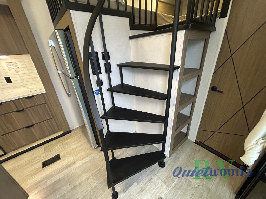 You will feel right at home in this destination trailer! It has not only has one loft in the rear with two 42" x 74" bunk mats, but also a second loft in the front with spiral steps leading up to two bunk mats. The front private bedroom features a king bed slide with Versa-Tilt to lay your head on at night with front windows to let in lots of natural lighting and sunshine in the morning. Relax in true comfort at night on the L-shaped sectional sofa across from the entertainment center with a fireplace. The kitchen island provides extra space to prepare delicious meals and comes with four bar stools to enjoy your breakfast each morning. Everyone will stay fresh and clean with a walk-in shower in the rear private bedroom, plus there is washer and dryer prep if you choose to add those appliances. Head outside through either the patio door or the second entry/exit door each day!