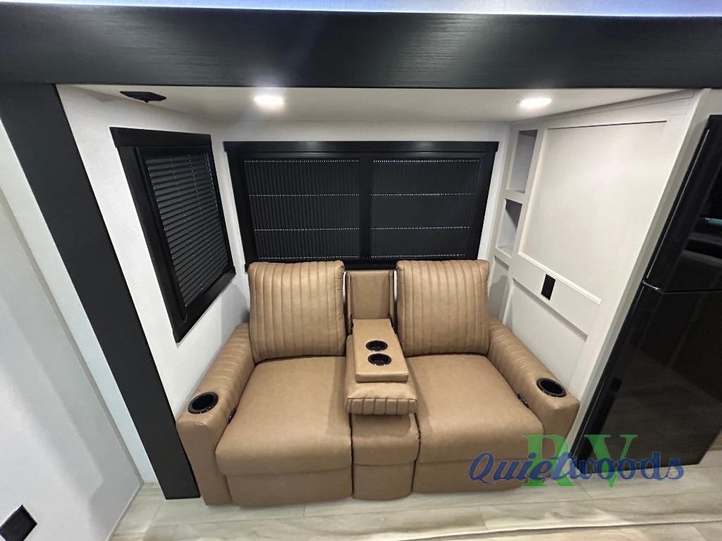 This is the perfect couple's trailer for weekend trips to the campground. The front kitchen includes ample counter space, including a bar top with two stools. You can relax on the theater seat within the slide out here, and the pantry and 12V refrigerator is close by so you can grab a snack. A master bedroom includes a custom king bed slide out, a panoramic window, an ottoman, plus a dresser with a fireplace to make your space cozy. The full rear bath includes dual bath sinks, a walk-in shower with a skylight, plus washer and dryer connections if you want to add those appliances.