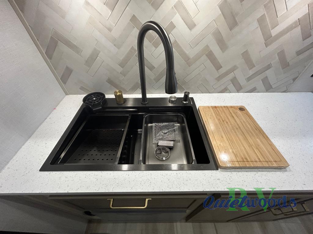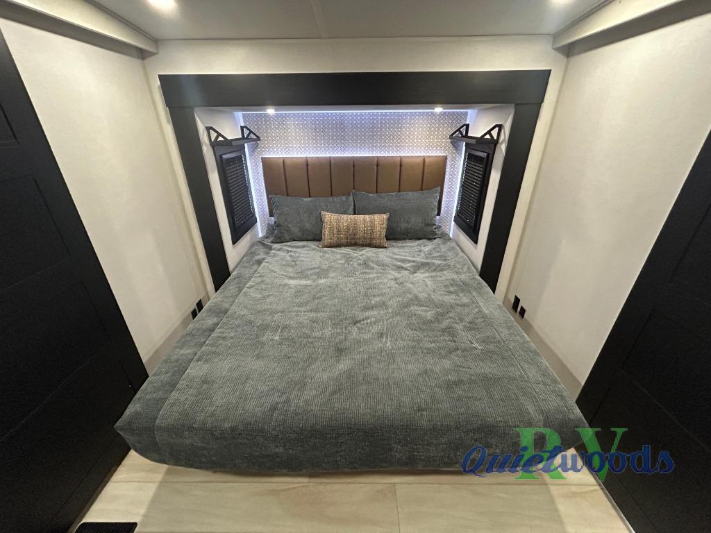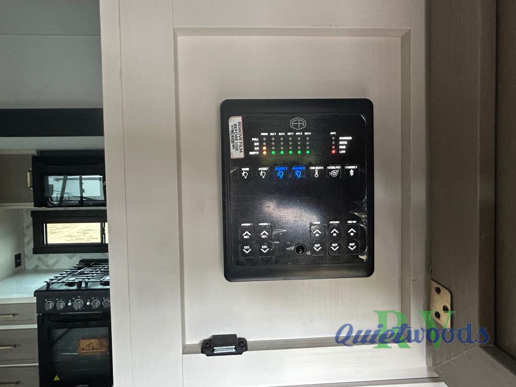 The RV is built with laminated "Aluma Frame" sidewalls and floor and a fiberglass exterior. It comes with a 15,000 BTU A/C and is prepped for a second A/C unit. It has a 49-gallon fresh water tank, a 78-gallon gray water tank, and a 30-gallon black water tank. Other features include a 21-foot power awning with LED lights, a universal docking station, and a heated and enclosed underbelly with 12V tank heaters for all-season use. It also has a 60K BTU on-demand tankless water heater.