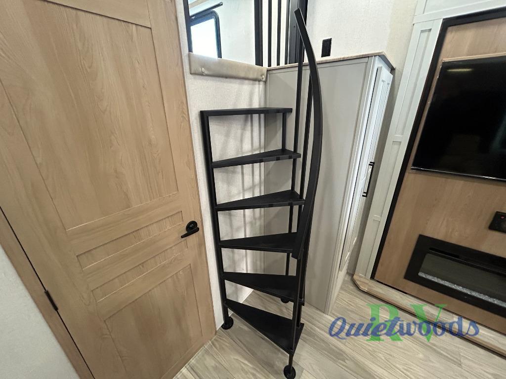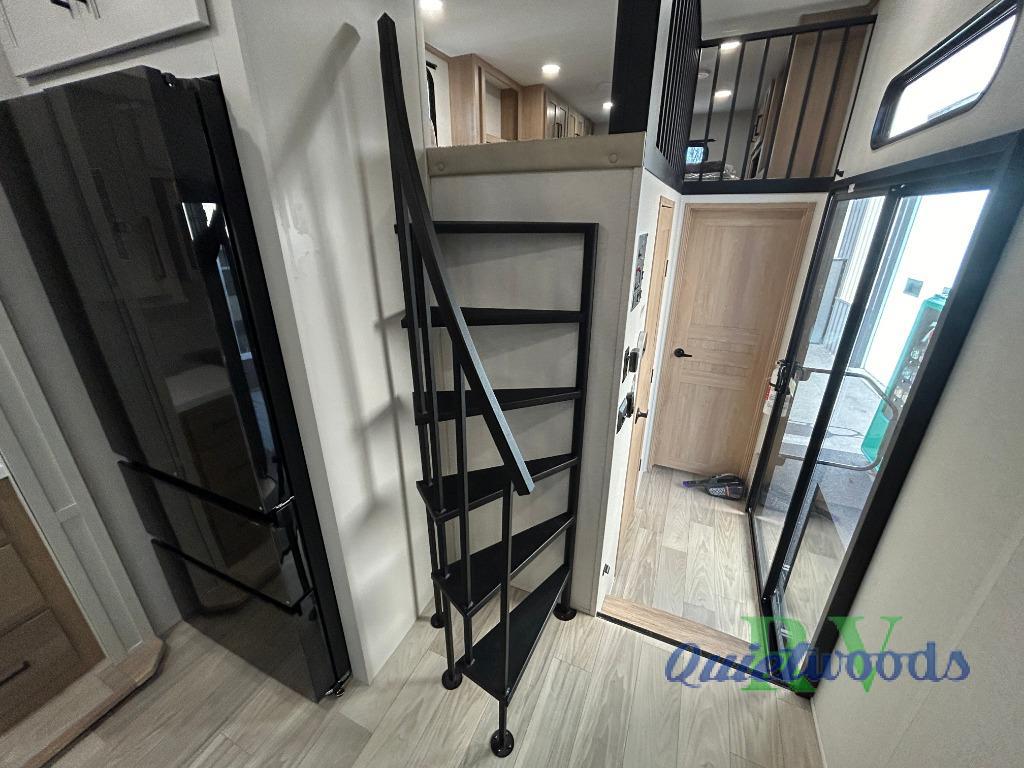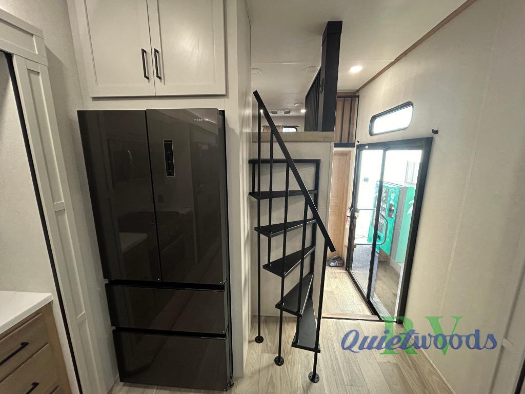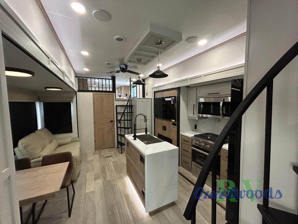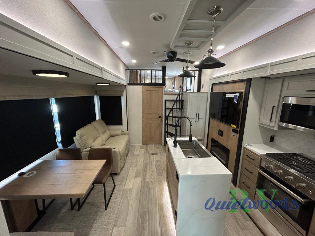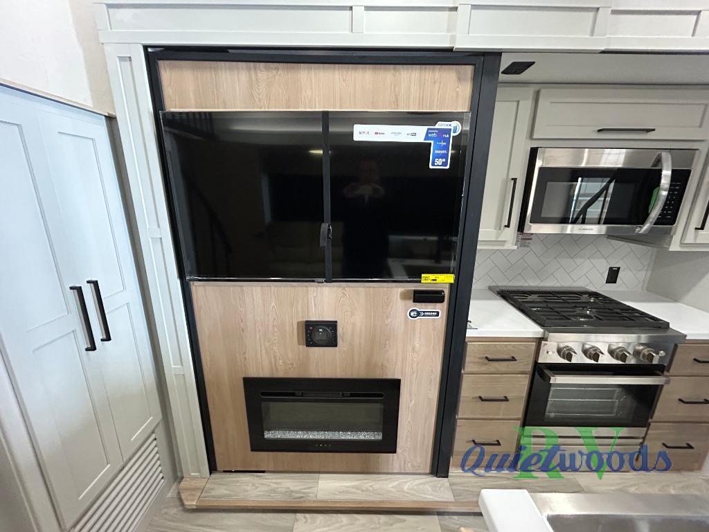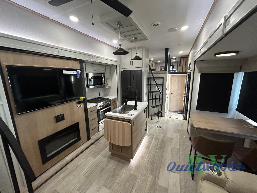 You won't believe the comfort and convenience found in this destination trailer. There are two private bedrooms; one up front with a queen bed slide out and storage space, and one in back with a queen bed slide out and a half bath! There is even washer and dryer prep here if you want to add those appliances and the second entry door is also found in this location so you can easily slip out in the morning. Above each of these rooms is a loft providing three total bunk mats for sleeping, storage cabinets, and TV prep if you want to add entertainment. Everyone can meet in the combined kitchen and living room that includes dual opposing slides, a 60" theater seating across from a 50" flat screen TV and fireplace, plus a free-standing table with chairs and a bench to dine at. The chef of your group will love the large kitchen island, Chef Collection three burner range, and a 16.2 cu. ft. refrigerator for food storage.