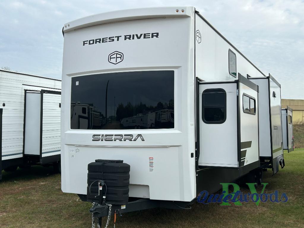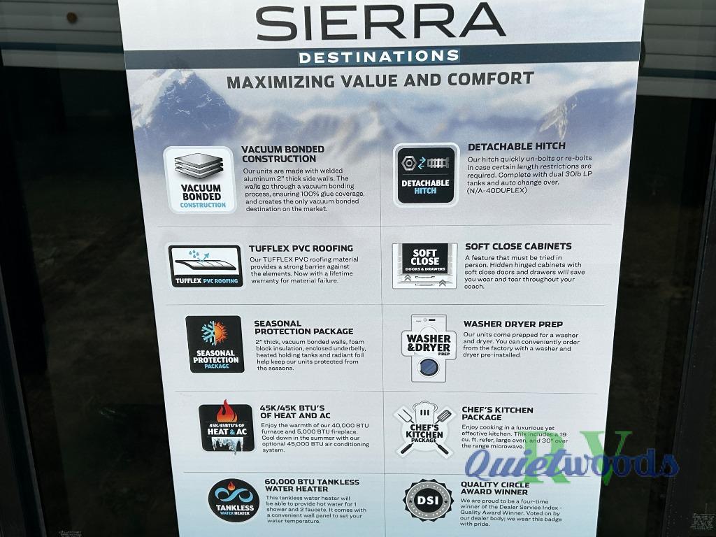 With each Sierra Destination Trailer by Forest River you will enjoy many luxurious features, such as crown molding over the kitchen cabinets, solid surface kitchen countertops, a memory foam mattress, plus so much more. The extra large picture windows throughout let natural light in and provide beautiful outdoor views, and each model includes three or more slides for added interior space. You'll find many exterior conveniences, like the porch light with an interior switch, the rain gutters with extra long drip spouts to prevent black streaking, and an electric awning with LED light strip, plus more! You will stay comfortable year around with dual 15,000 A/C units plus each model is constructed with an Underbelly Armor for better protection and insulation!