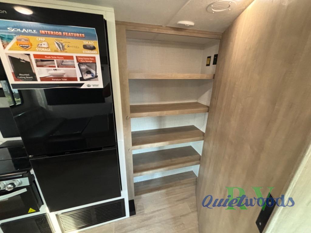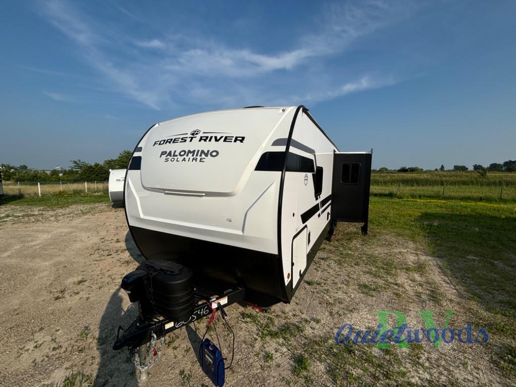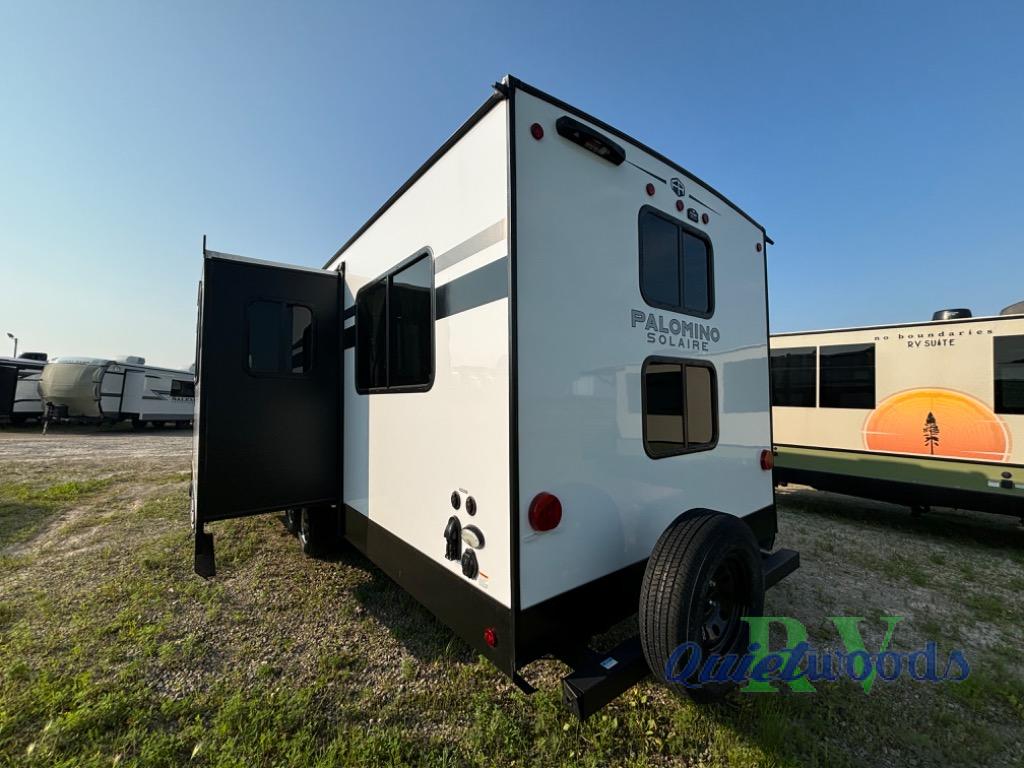 Each SolAire travel trailer by Palomino features a white gel coat exterior and an aluminum superstructure frame for lightweight towing. You will love having a power tongue jack for easy set up, plus slam latch baggage doors with magnets to make unloading easier than ever. There is also a power awning with LED lights and aluminum wheels included on the exterior. Each SolAire is constructed to last with Azdel composite, a fully laminated rear wall and roof, plus a fully enclosed and heated underbelly. The interior includes roller shades and kitchen backsplash, USB ports to keep your electronics charged, a Bluetooth stereo with speakers, and many more stand-out features!