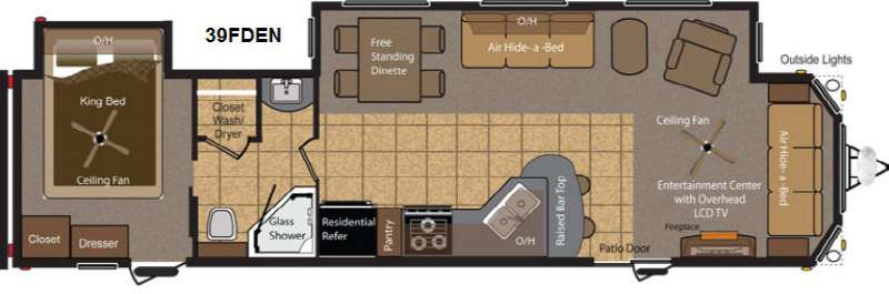 Retreat Destination Trailer by Keystone RV w/Rear King Bed Slide, Dresser, Closet, Private Bedroom Entry, Closet Washer/Dryer, Sink, Corner Shower, Linen Cabinet & Toilet, Free Standing Dinette, Air Bed Sofa w/Overhead Storage, End Table, Lounge Chair, 2nd Air Bed Sofa w/End Tables, Ent. Center w/LCD TV & Fireplace, Patio Doors, Raised Bar Top w/Stools, Double Kitchen Sink, 3 Burner Range, Pantry & Refrigerator and More!