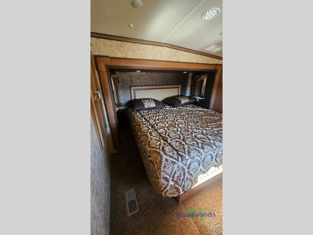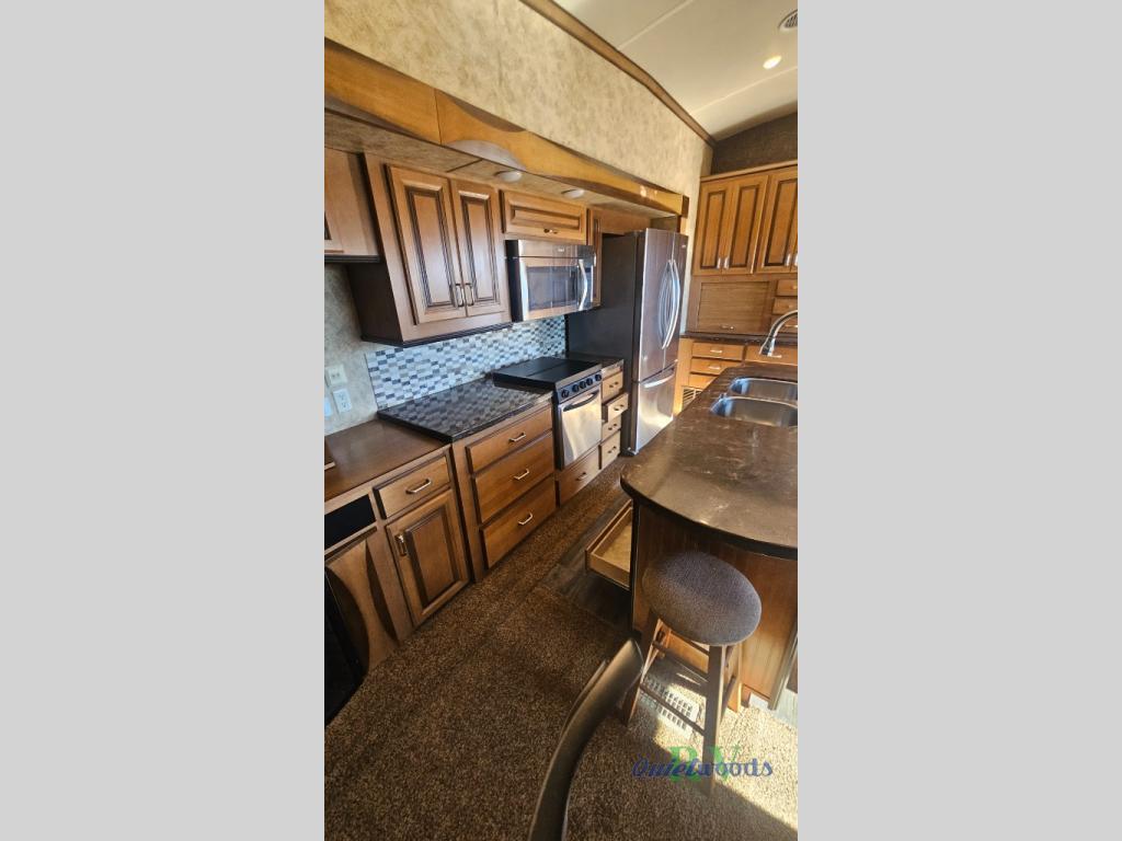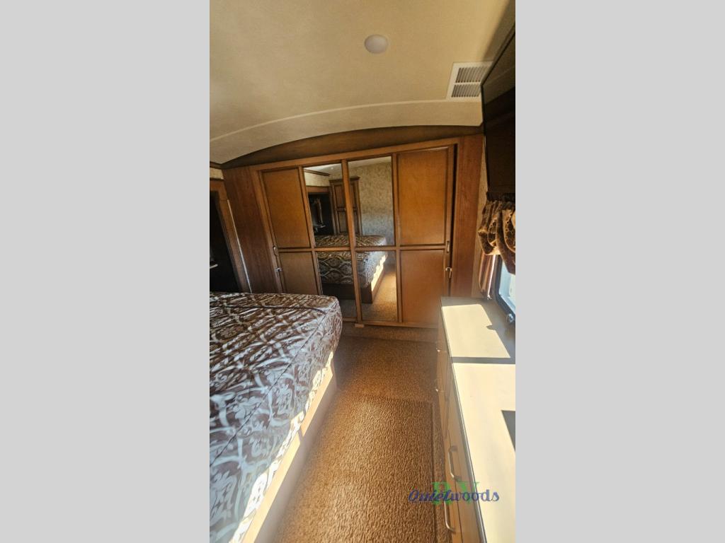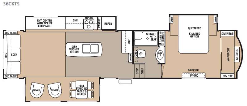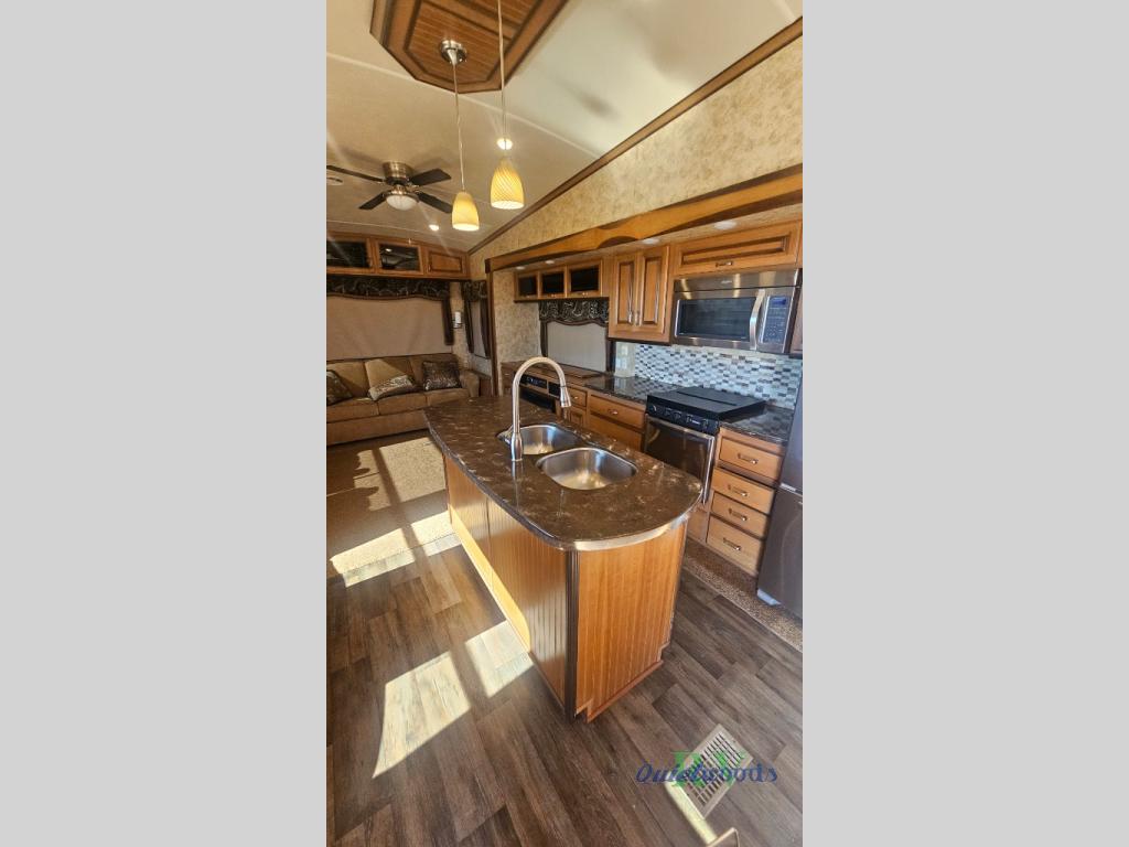 Two generous slide outs are located in the main living/kitchen area. As you enter this Cedar Creek, to the left is a slide out which has a free standing dinette with chairs, and two lounge chairs. A sofa with end table at each end and overhead cabinets runs the width of the back wall. Continuing around, another slide features a fireplace with TV lift, three burner range top, overhead microwave, pantry, refrigerator, and overhead cabinet storage. The kitchen is rounded out with a beautiful Hoosier style kitchen cabinet with extra counter space, a closet and an island with a double kitchen sink. You may choose to add an optional dishwasher to the island.