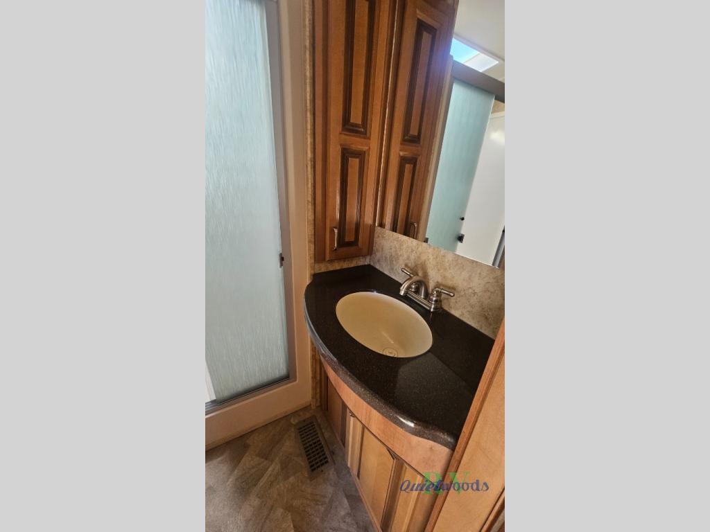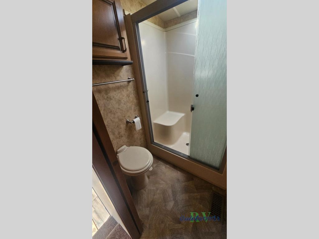 Up the steps towards the front of the fifth wheel the bathroom is on your left. It includes a vanity sink, medicine cabinet, residential size shower with seat, toilet and overhead cabinet.