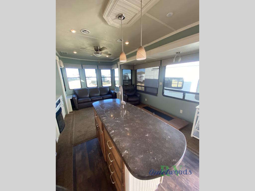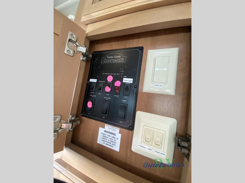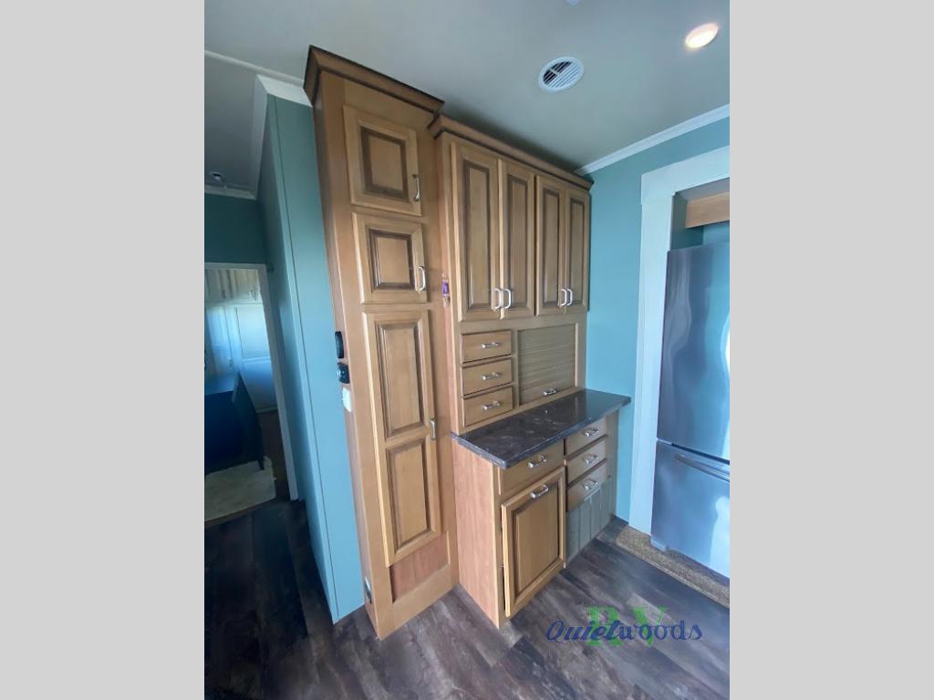 As you enter the 40CCK Cedar Creek Cottage destination trailer by Forest River you will be wowed by the space that the triple slide outs provide this destination trailer.