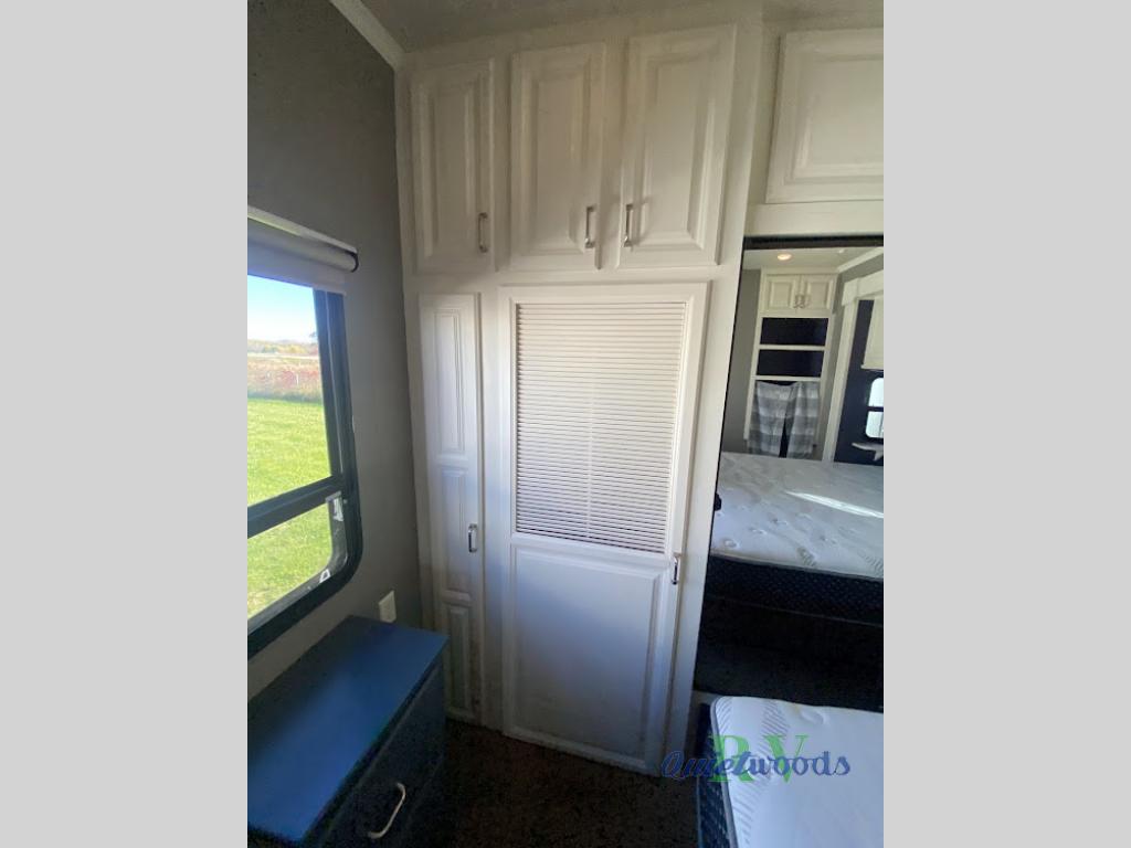 The rear bedroom offers a queen bed slide, a wardrobe, washer and dryer prepped, and drawers. You will also find a dresser opposite the bed for additional storage. There is a convenient second entry door into the bedroom.