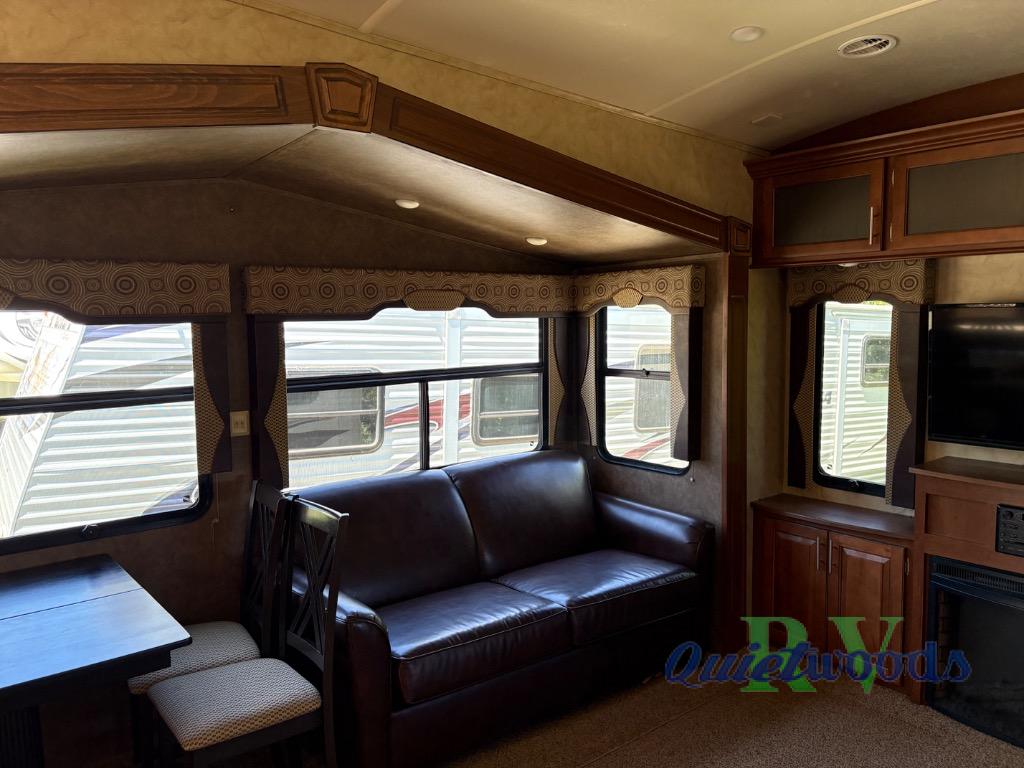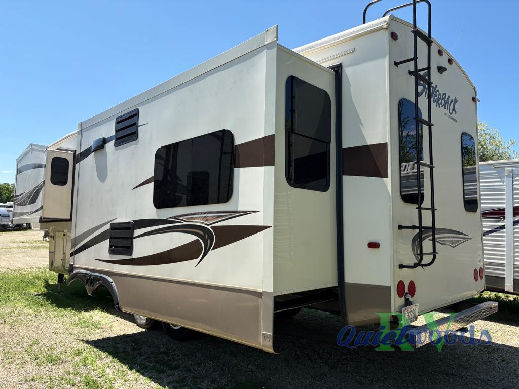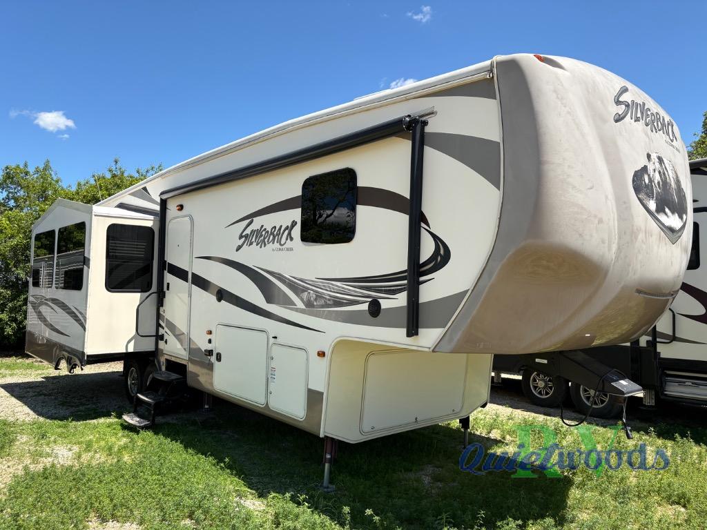 The Cedar Creek Silverback 29RE fifth wheel by Forest River features a full wall rear entertainment center, and three slides.