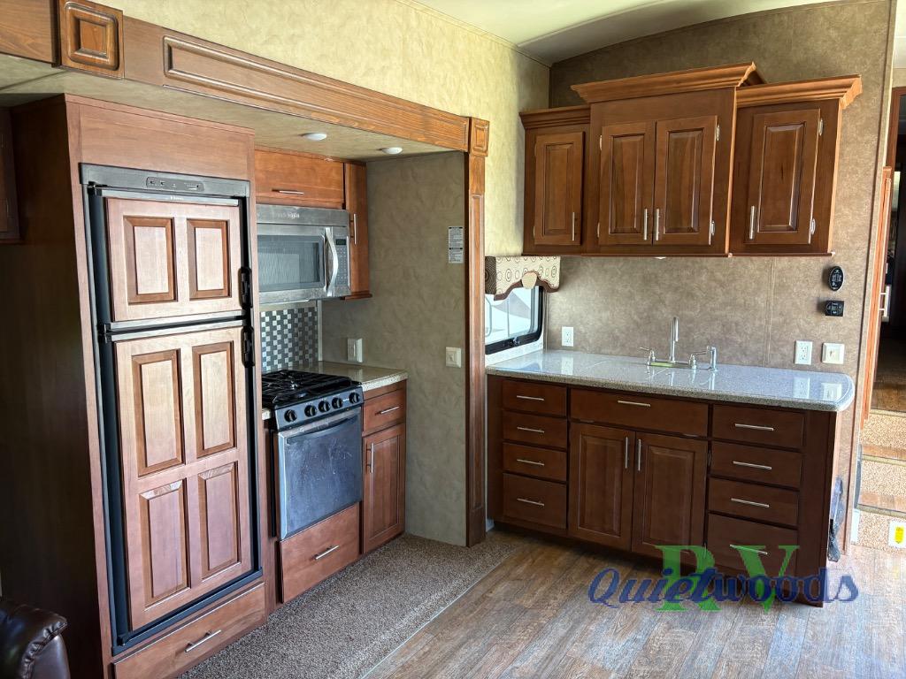 As you enter the fifth wheel, to the left is a slide with a dinette and sofa. The rear wall has an entertainment center. There is an additional slide with two lounge chairs, refrigerator, three burner range, and microwave. You will also find the double kitchen sink along one wall with counter space surrounding the sink.