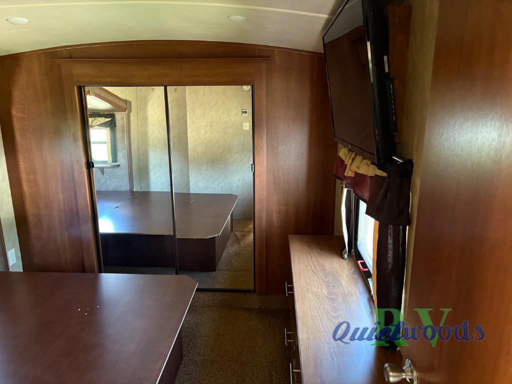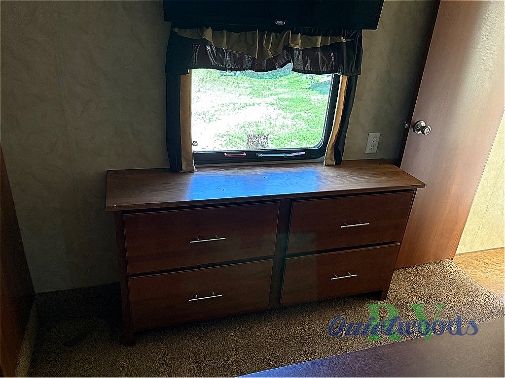 The front bedroom has much room with a queen bed slide or you can choose an optional king bed. Across from the bed there is a dresser with a TV above the dresser. The front wardrobe offers additional storage as well as having an optional washer/dryer combo.