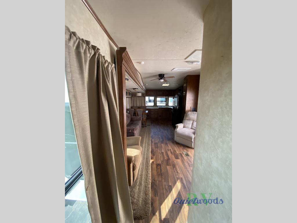 As you enter the trailer, to the left there is a corner entertainment center with a fireplace. To the right of the entrance you will find a pantry, refrigerator, four burner range, microwave, lots of counter space, and a double kitchen sink. The slide offers a free-standing dinette, sofa, and a lounge chair.