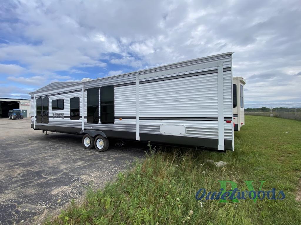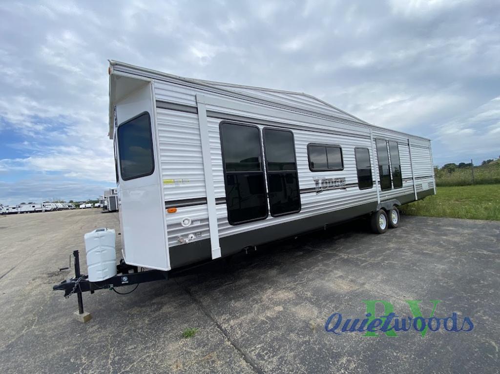 The Wildwood Lodge 394FKDS destination trailer by Forest River offers double slides and a front kitchen.