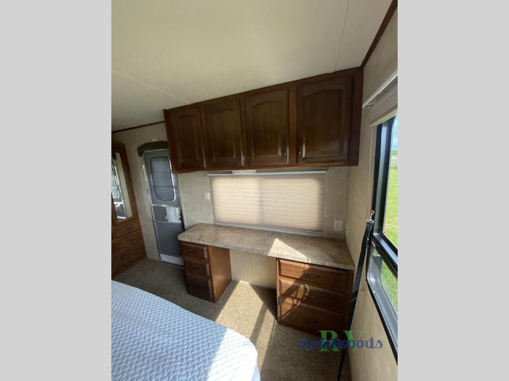 The rear bedroom has a slide king bed with nightstands. Along one wall there is a wardrobe and an optional washer and dryer. You will also find much storage with the dresser. There is a private entrance outside from the bedroom.