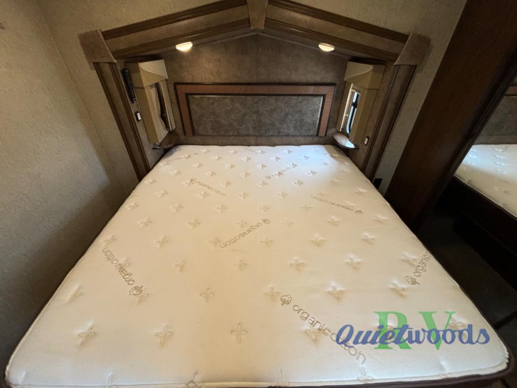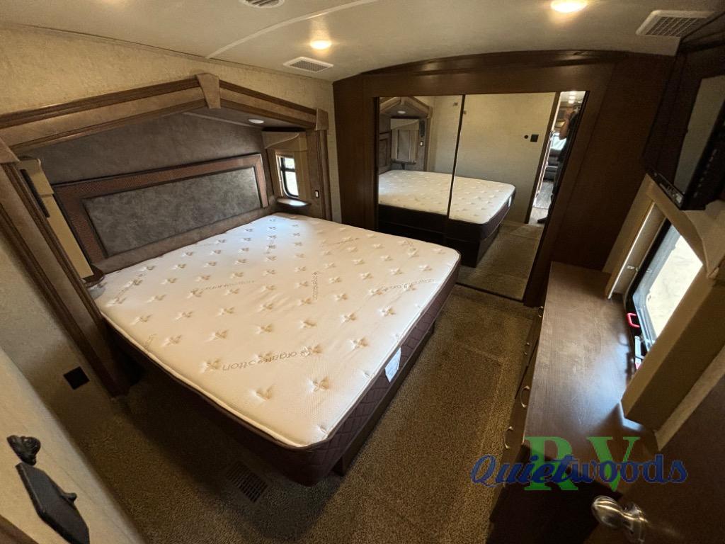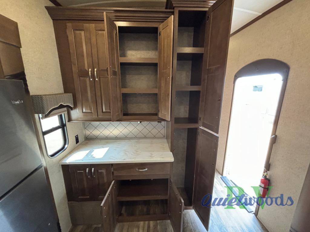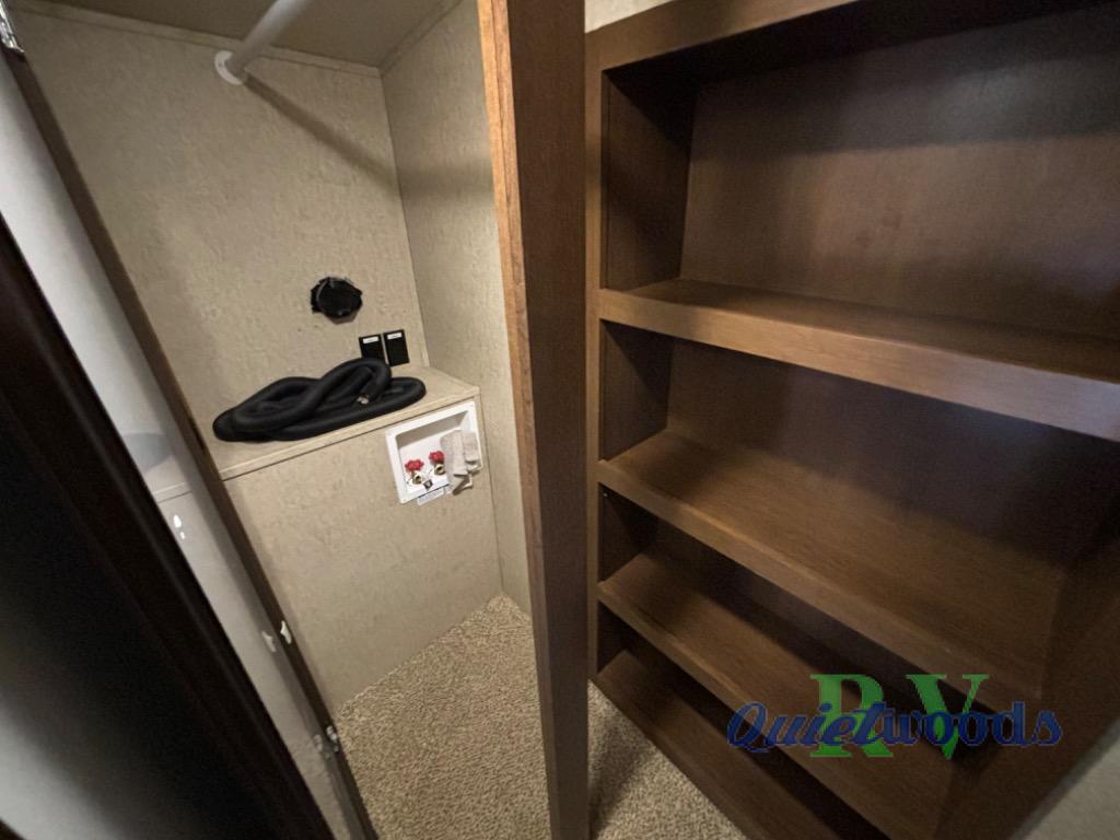 Continue toward the front where you will find the perfect spot to unwind, and sleep comfortably. You will enjoy the added space thanks to a slide out queen or optional king size bed. Like the living space this slide features cathedral ceiling styling. There is a dresser for your clothing opposite the bed, and a full front wardrobe with drawers, shelves, and a place for all of your hanging clothing. You will even find that it has been prepped for a stackable washer and dryer if you choose to add, plus so much more!