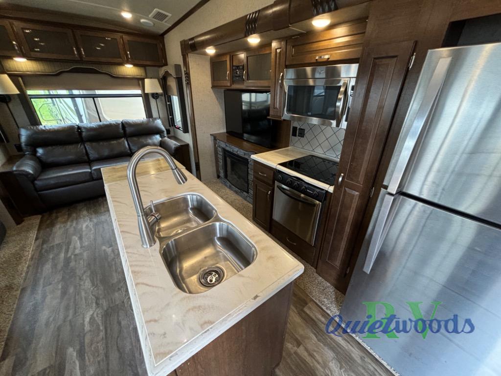 When it is time to cook you will find this Silverback Edition kitchen in perfect order. There is a refrigerator, a food pantry, and a three burner range with overhead microwave oven in a slide out opposite the entry door. This slide also features a 48" LED TV with fireplace, and storage overhead so you can tuck away all of your things neatly out of the way. There is also a center island which provides added prep space, and a double sink. Along the interior wall you will find added counter space and storage cabinets, plus a closet for your coats.