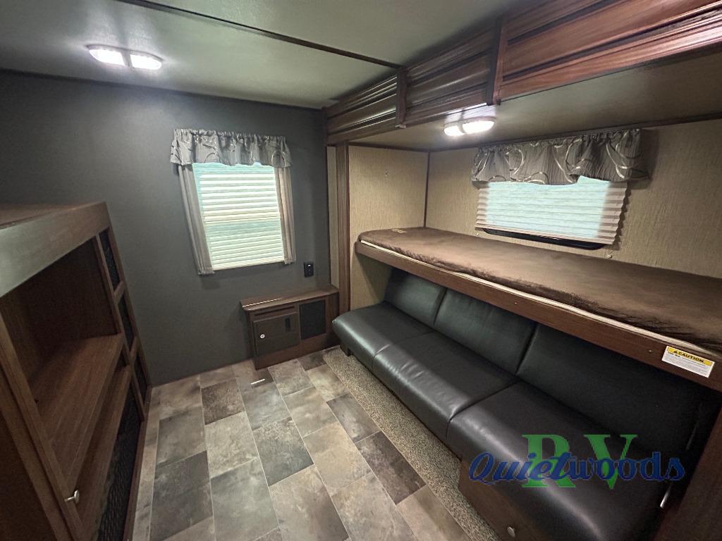 The rear bunkhouse is where you will most likely find the kids hanging out. There is a slide out flip-over sofa with an overhead bunk along the road side. Along the rear wall a bit of storage, and along the curb side beneath the outdoor kitchen enjoy a bunk above more storage.
