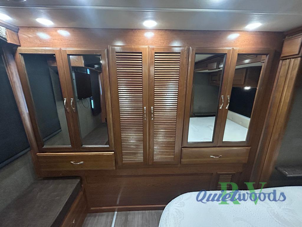In the private rear bedroom, a king bed slide ensures restful nights while the large wardrobe and dresser provide generous storage for extended travel. The spacious bath includes a shower with skylight and everything you need to stay refreshed.