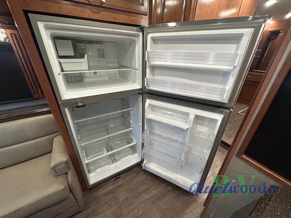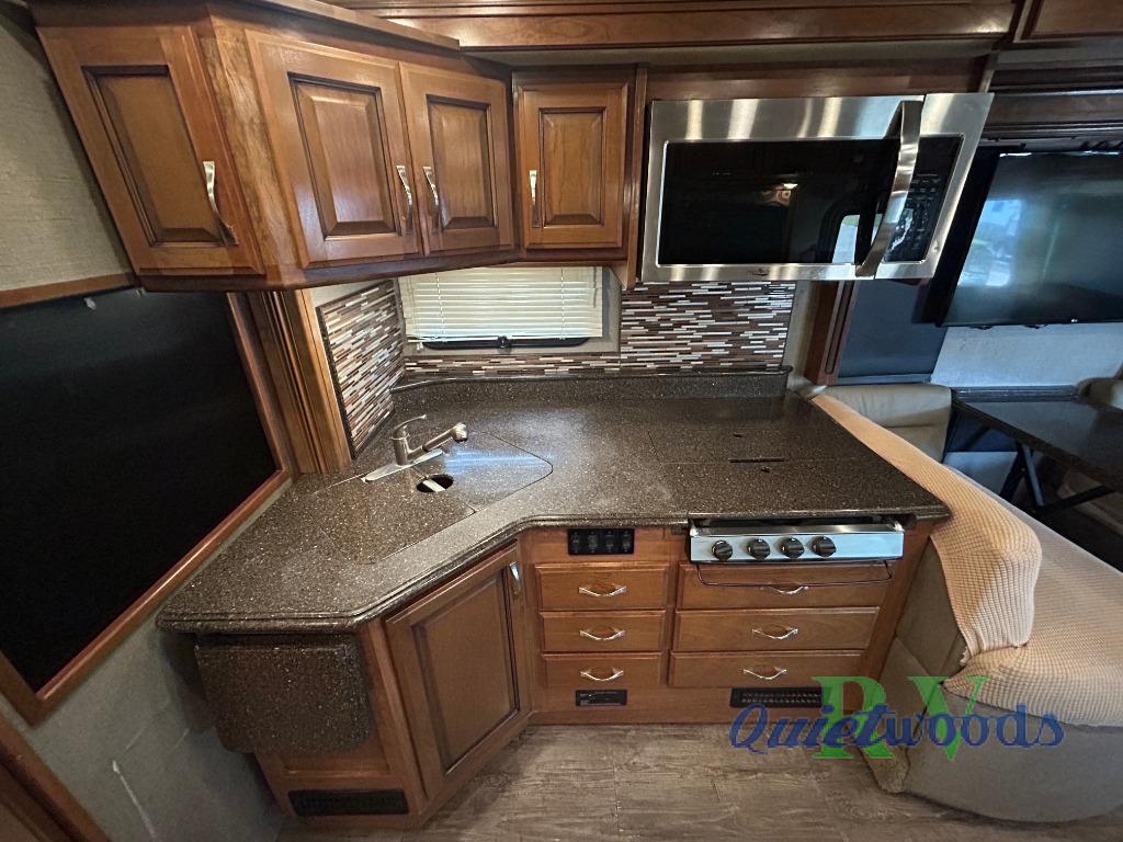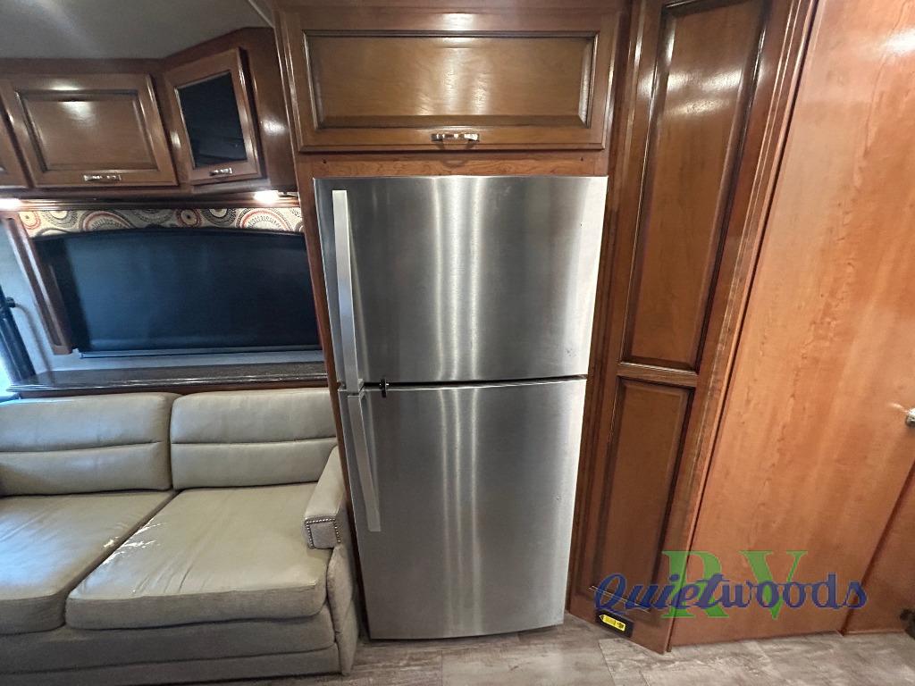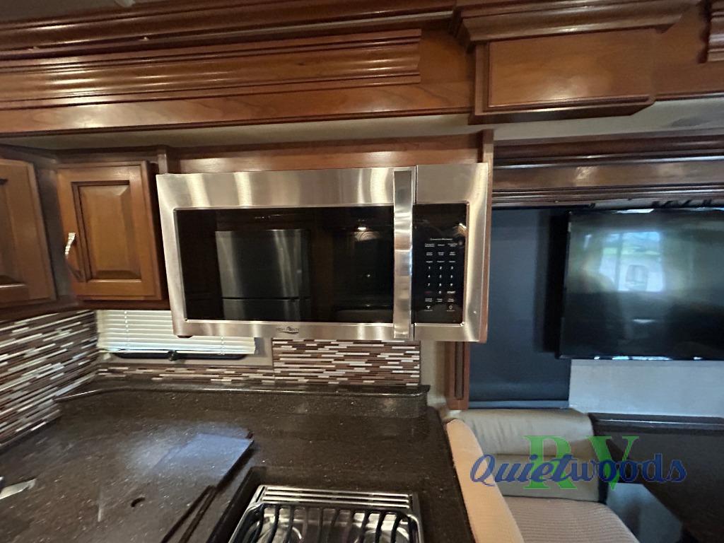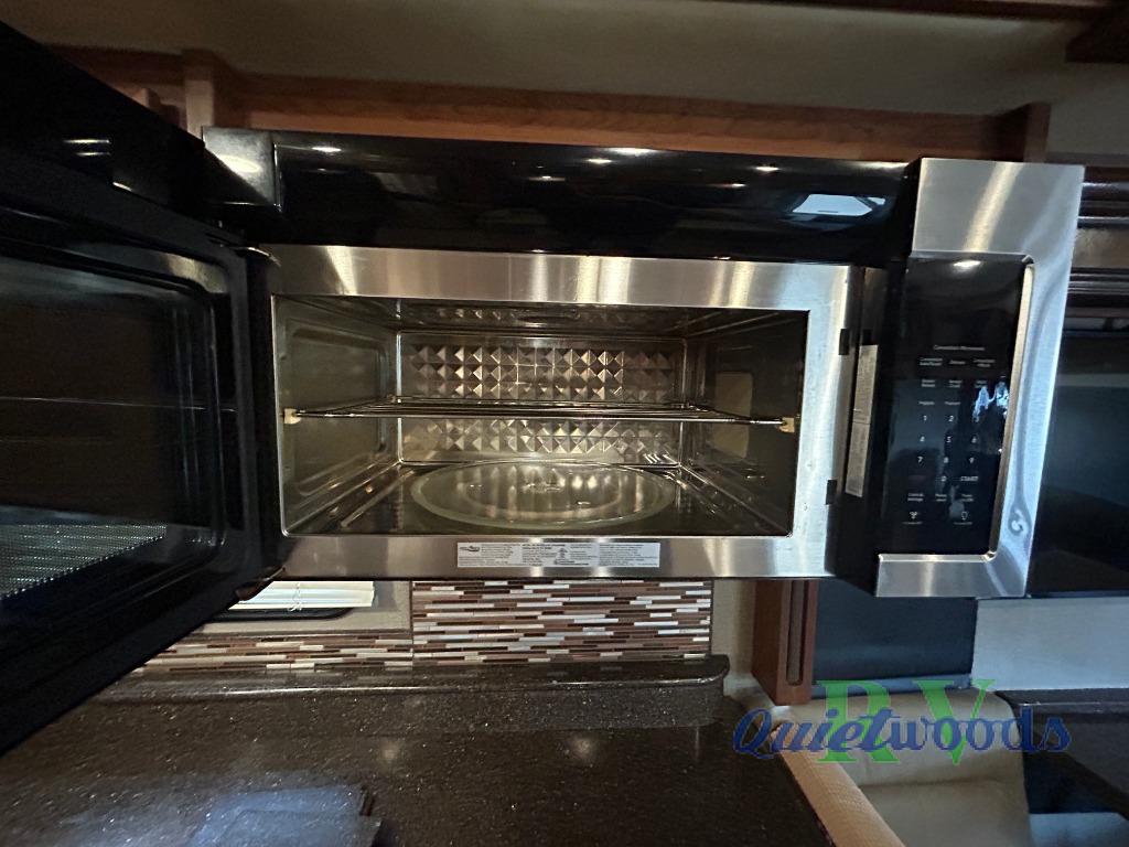 Inside, a full-wall slide opens the living space, making room for theater seating across from the 49" LED TV and cozy fireplace. The kitchen is fully equipped with a residential refrigerator, convection microwave, and plenty of counter space so you can enjoy home-cooked meals on the road.